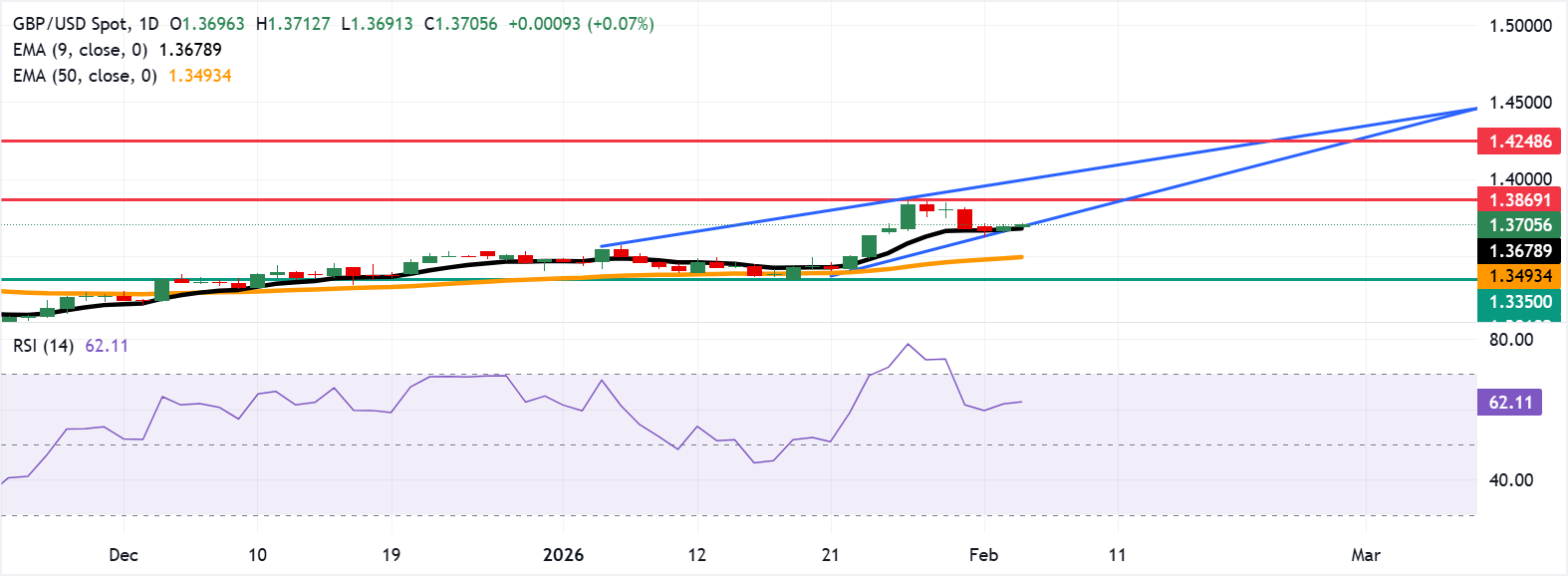 英镑/美元在前一交易日小幅上涨后趋于稳定,周三亚洲时段交投于1.3700附近。日线图的技术分析显示出潜在的看跌反转,因为区间收窄,表明在上升楔形模式中买方动能减弱。 标题:英镑/美元价格预测:稳固在1.3700上方,接近九日EMA支撑