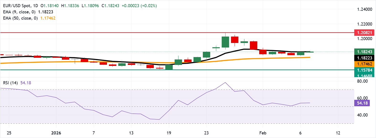 欧元/美元在前一交易日小幅上涨后仍处于积极区域,周一亚洲时段交投于1.1820附近。14日相对强弱指数(RSI)动量指标为54(中性),正在上升,显示出动能改善。 标题:欧元/美元价格预测:在1.1800上方徘徊于九日指数移动平均线附近