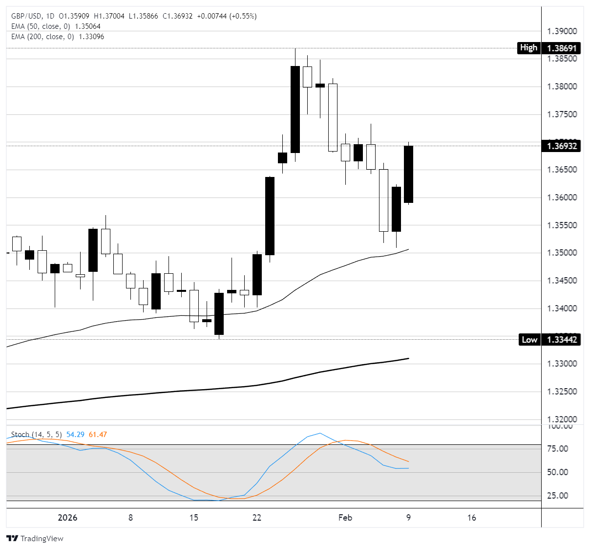 英镑/美元在日线图上保持更广泛的看涨结构,价格远高于50日指数移动均线(EMA)1.3507和200日EMA 1.3310,确认了自2025年11月接近1.2300的低点以来的中期上升趋势。然而,在英国央行(BoE)以5-4的鸽派投票决定将利率维持在3.75%后,该货币对从1.3869的1月高点急剧回落,四名货币政策委员会成员推动立即下调25个基点。周一的交易中,价格从周五接近1.3600的收盘价反弹至约1.3695,形成了一根看涨的日线蜡烛,重新夺回了1.3690水平以上的区域。该区域大致与1月下旬在1.3690和1.3770之间的盘整区间相符,此前该区间曾作为支撑位,直到上周的突破。围绕首 标题:随着市场迈向周中非农数据,英镑/美元倾向看涨