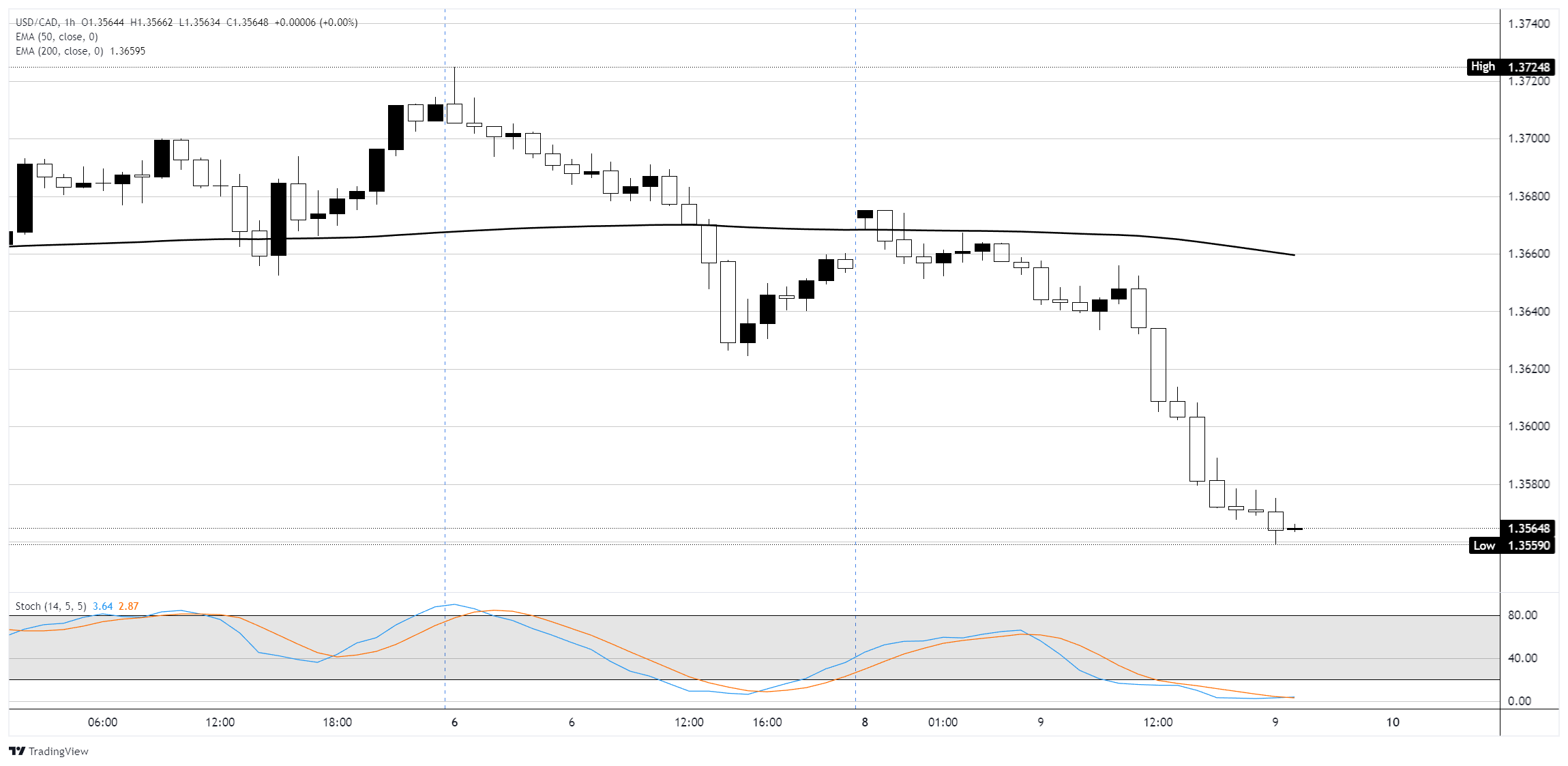 美元/加元在日图上保持更广泛的看跌结构,交易于1.3560附近,此前在2025年突破了2021年的长期上升趋势 标题:加元上涨,美元疲软