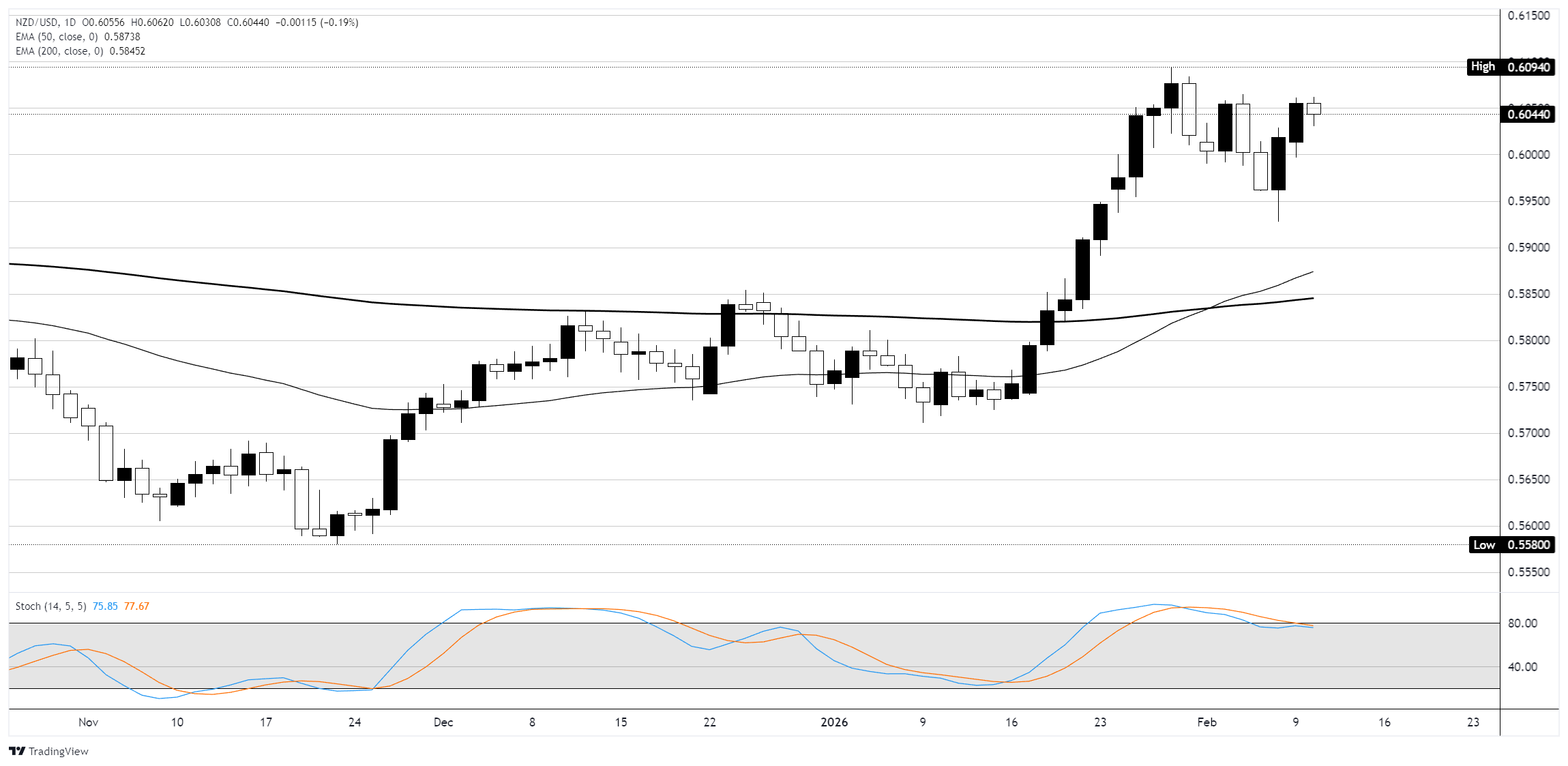 纽元/美元在日线图上呈现出明显的上升趋势,价格在经历了从11月底接近0.5580的强劲反弹后,稳稳保持在0.5874的50日指数移动平均线(EMA)和0.5845的200日EMA之上 标题:纽元/美元在0.6050附近受限,等待美国非农就业数据发布