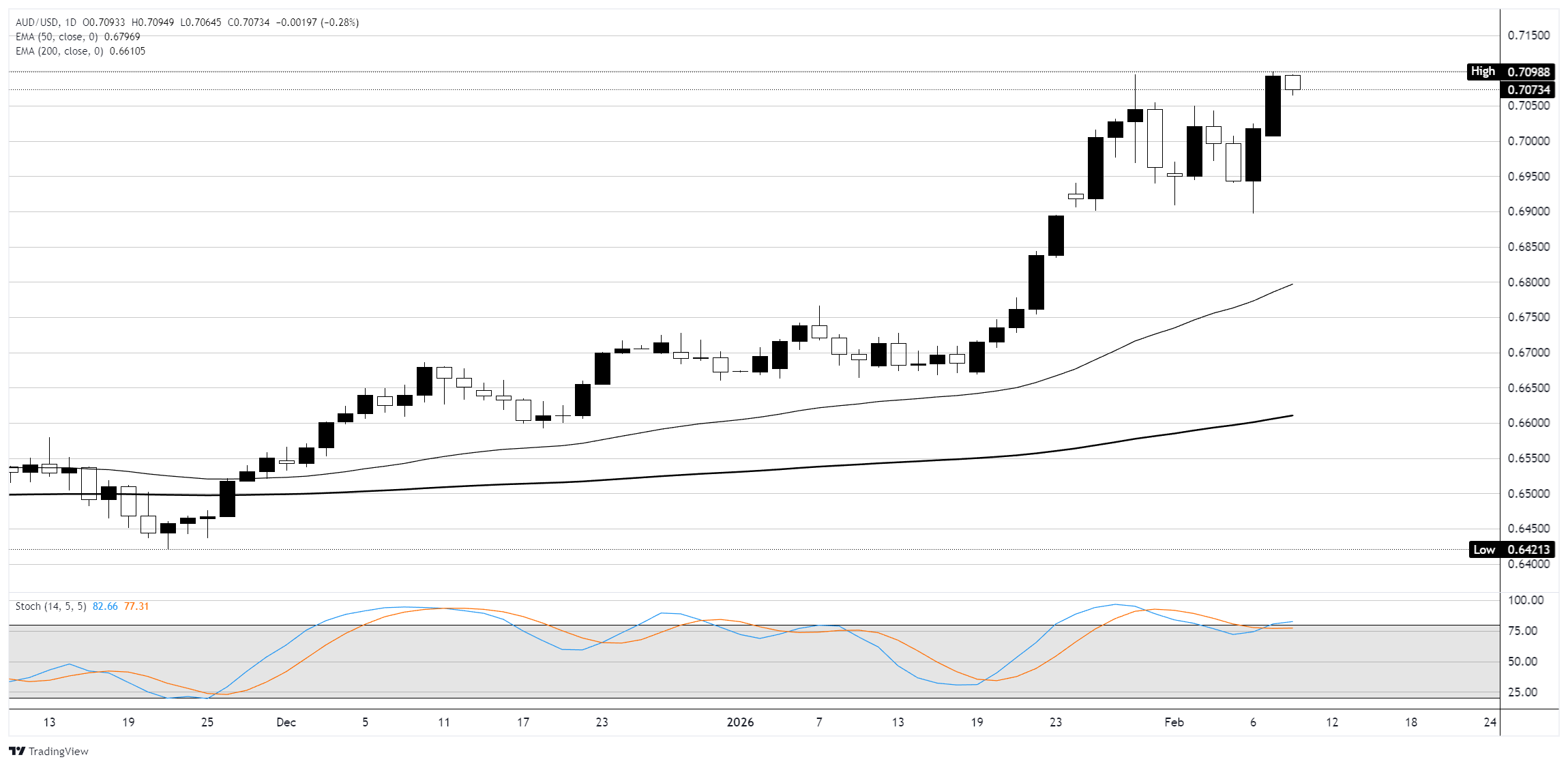 澳大利亚元在日线图上保持强劲的上升趋势,价格远高于50日指数移动平均线(EMA)0.6797和200日EMA 0.6611,确认自11月底接近0.6421的低点以来,形成了明确的看涨结构,表现为更高的高点和更高的低点 标题:澳元/美元在周中非农数据来临之际稍作喘息