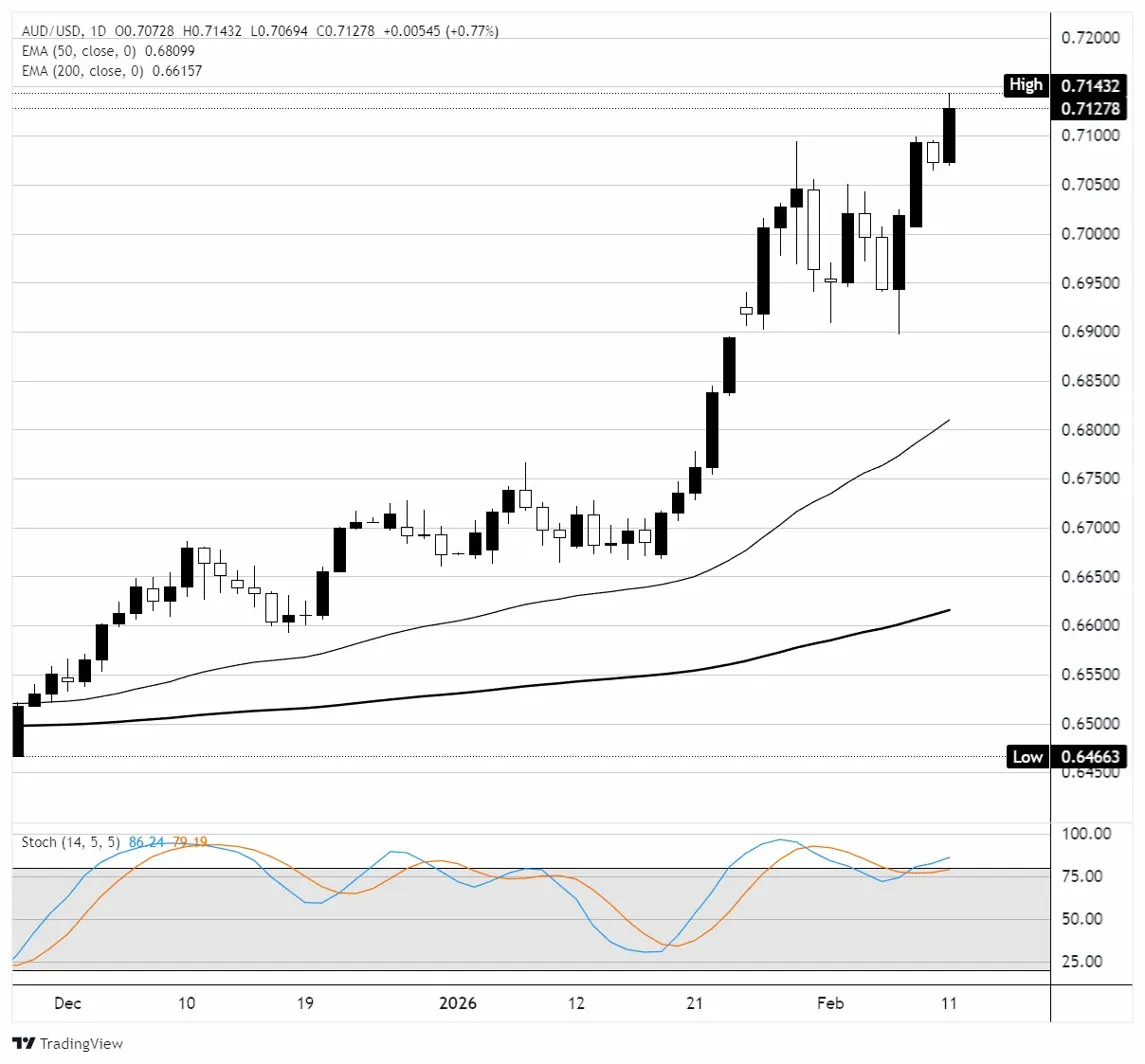 在周三,澳元飙升至自2022年8月以来的最高水平,此前延迟发布的美国非农就业人数(NFP)报告显示,新增就业人数强于预期,达到13万人,远高于70,000的共识,尽管2025年非农就业数据大幅下调(仅2025年3月就下调了89.8万人),使整体劳动力市场的前景显得疲弱。市场解读基准修订为更深层次经济放缓的确认,导致美元下跌,2025年的平均月新增就业人数从之前报告的49,000下调至仅15,000。 标题:美国非农就业数据超预期,澳元/美元猛涨至高位