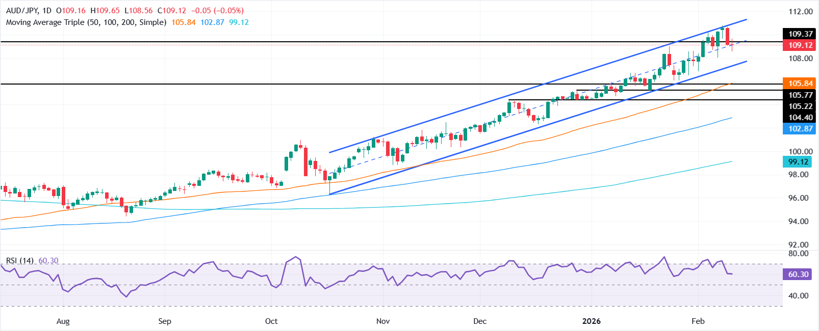 周三,澳元兑日元贬值超过1%,主要受日元整体强势的影响,这一强势源于高市长在周末的压倒性胜利。撰写时,AUD/JPY交易于109.23。 标题:澳元/日元价格预测:下滑超过1%,但仍然保持看涨偏向