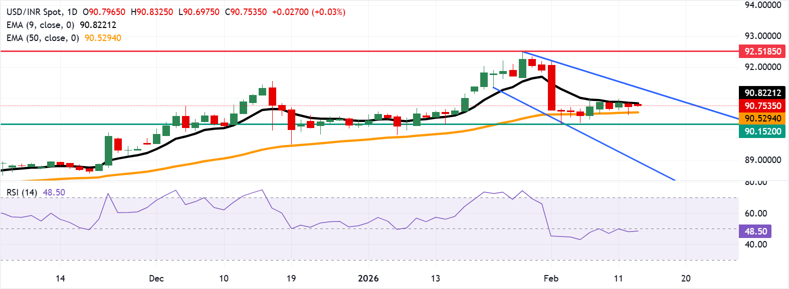 美元/印度卢比上涨,因印度卢比(INR)在广泛的风险规避情绪和亚洲货币疲软的背景下走弱。该货币对可能在90.50至91.00区间内交易,而投资者在持续的风险规避情绪中保持谨慎 标题:美元/印度卢比小幅上涨,因风险厌恶情绪导致印度卢比走弱