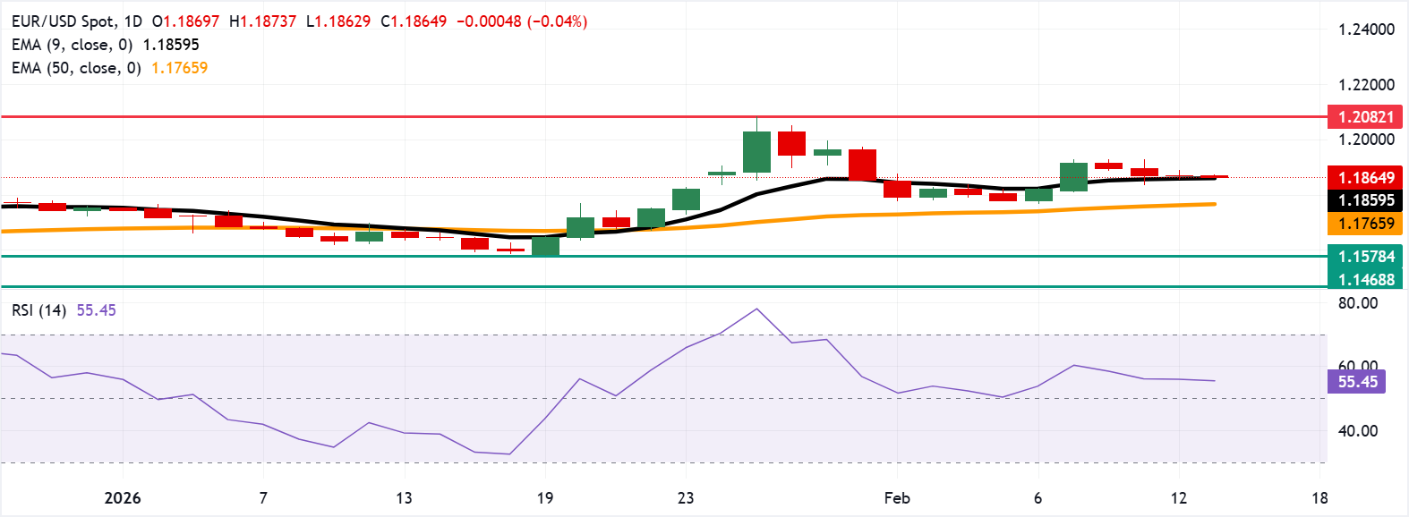 欧元/美元在连续第四个交易日保持在负区间,周五亚洲时段交易约为1.1870。14天相对强弱指数(RSI)动量指标为56,位于中线之上,确认了稳定的动量 标题:欧元/美元价格预测:测试接近1.1850的九日EMA支撑
