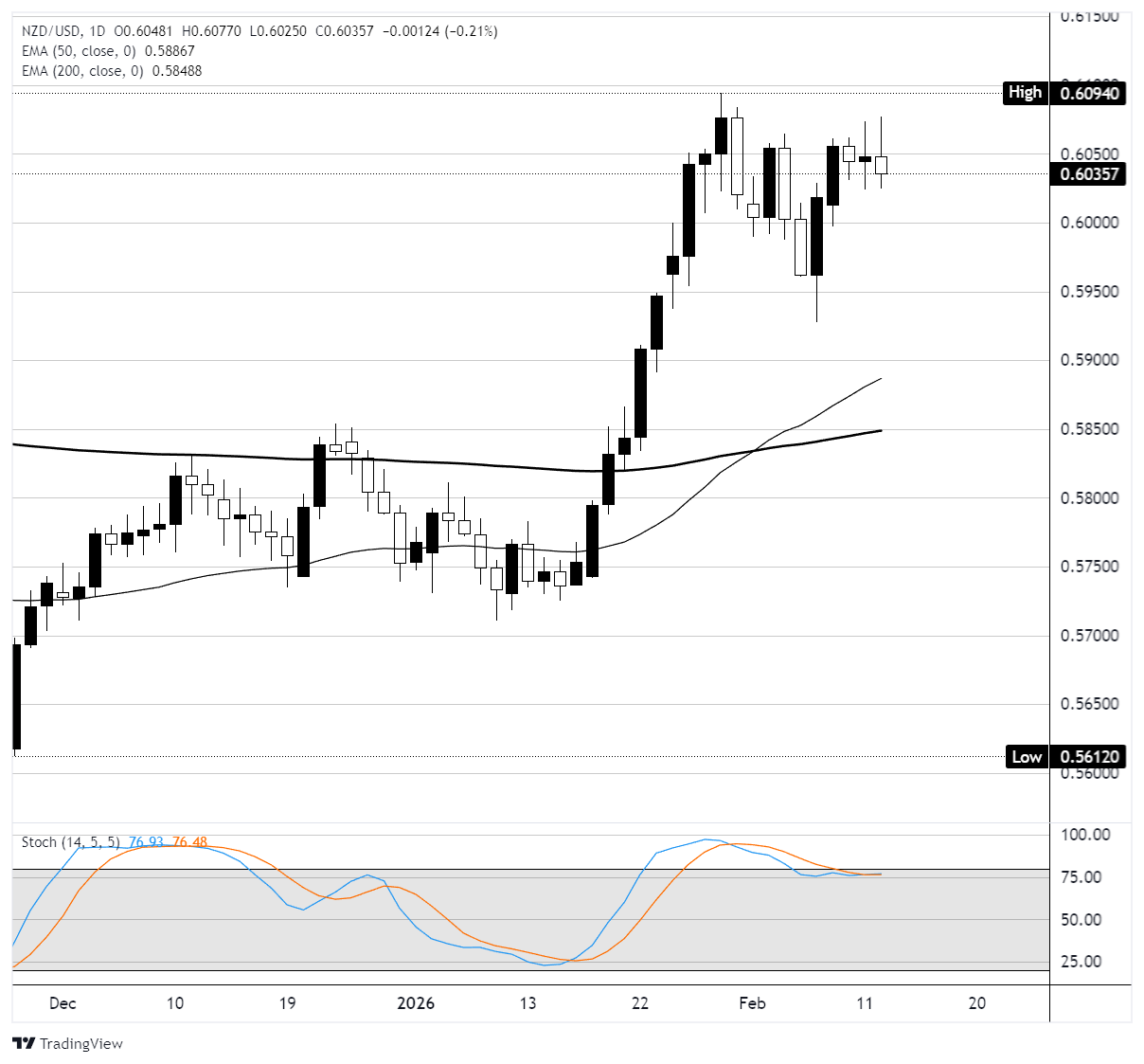 新西兰元升至约0.6057,为两周以来的最高水平,市场在评估纽储行(RBNZ)在2月18日货币政策声明前的政策前景。 标题:纽元/美元在0.6050附近保持稳定,动能减弱