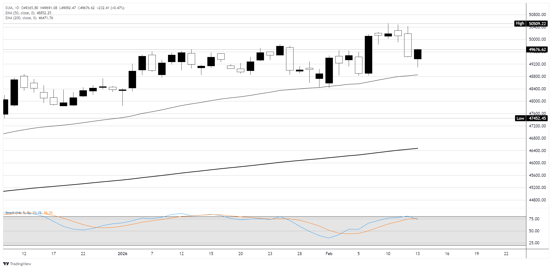 道琼斯工业平均指数(DJIA)在周五反弹,攀升约220点,交易接近49,665,开盘时为49,366。这一反弹是在周四因对人工智能引发的软件、卡车运输和房地产行业的干扰担忧而导致的669点重挫之后发生的。 标题:道琼斯工业平均指数在1月份CPI降温后回升,降息押注激增