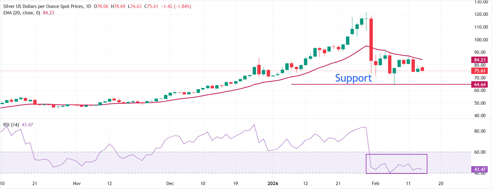 周一亚洲交易时段,银价(白银/美元)下跌2%,交投于75.00美元附近 标题:白银价格预测:白银/美元在周初下跌至75美元附近