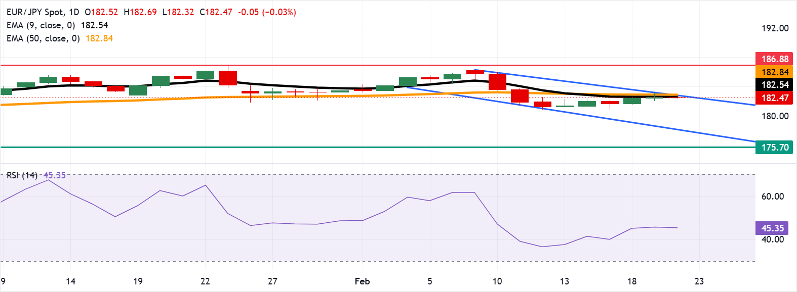 欧元/日元在连续两天上涨后小幅下跌,周五亚洲时段交投于182.40附近。日线图的技术分析显示,该货币对正在测试下降通道形态的上边界,暗示潜在的看涨反转。 标题:欧元/日元价格预测:测试182.50附近的汇聚阻力,九日指数移动平均线