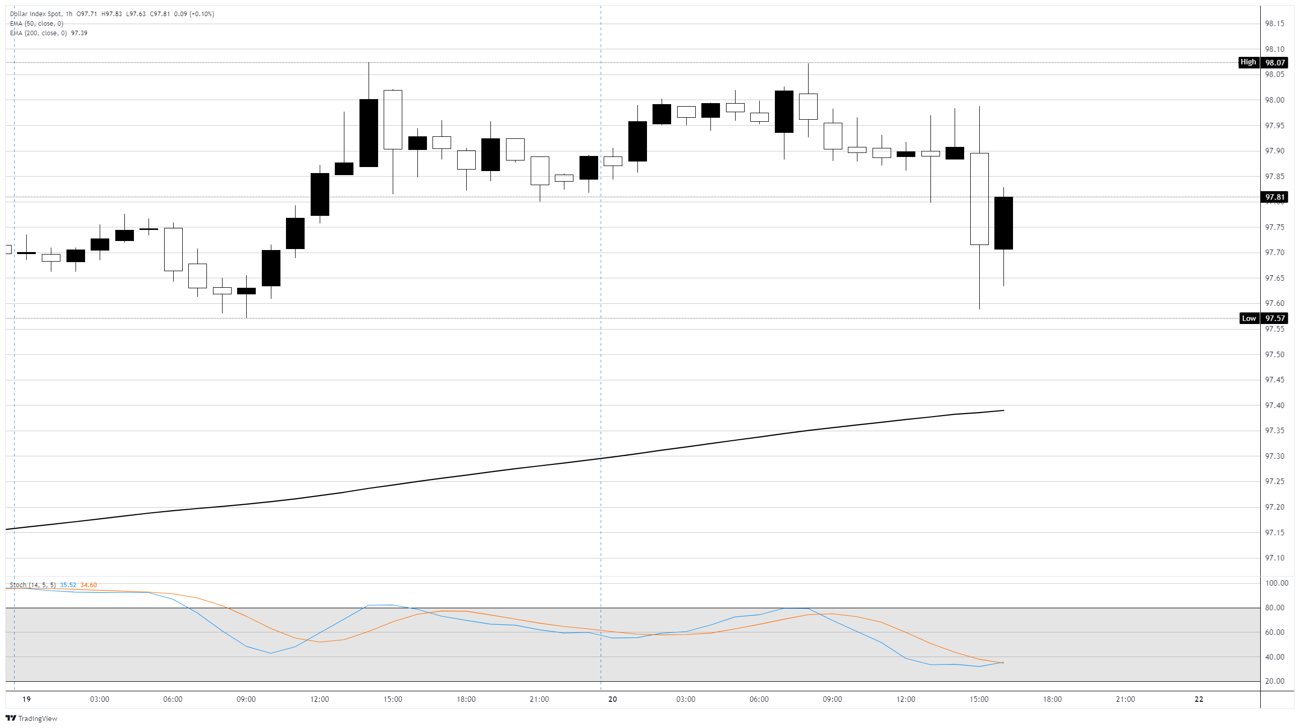美元指数(DXY)在周五大幅下跌,抛弃了早盘的涨幅,跌破97.75,因为美国最高法院以6-3的裁决推翻了特朗普总统广泛的IEEPA关税。 标题:美元指数因最高法院推翻特朗普关税而震荡