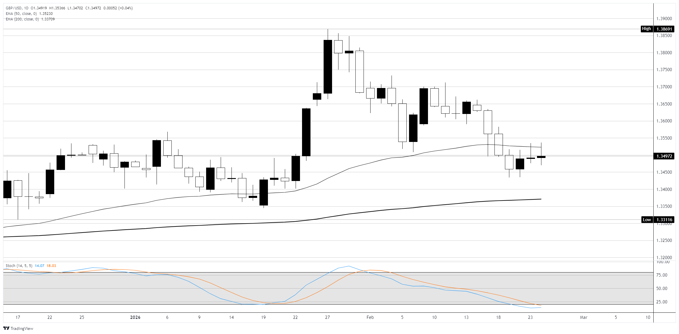 英镑/美元周二基本持平,徘徊在1.3500附近,交易清淡。该货币对从1月底接近1.3870的高点急剧回落,目前在50日指数移动平均线(EMA)附近窄幅盘整,过去两周的混合蜡烛群暗示在抛售后的犹豫。 标题:英镑/美元停滞不前,贝利提到服务业通胀