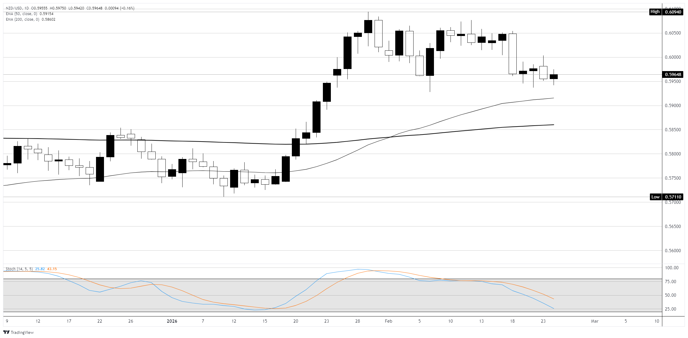 纽元/美元在周二下滑0.14%,收于接近0.5960的窄幅区间。该货币对交易于其关键移动平均线之上,但看涨动能已减弱。自2月初0.6090附近的高点以来,价格在保持在0.5940区域之上时回落,形成了一系列更低的高点,构成了一个下降楔形。 标题:纽元/美元小幅下跌,因加息预期减弱