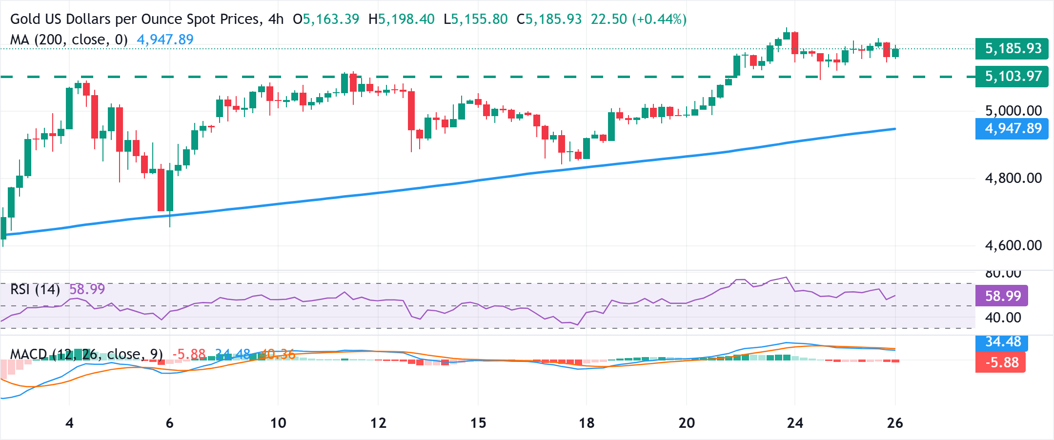 黄金(黄金/美元)在周四亚洲时段吸引了一些逢低买入者,继前一天的晚间回调后,价格回升至5200美元附近。这标志着连续第二天的积极走势,受到持续的避险资金流入的支持,这些资金流入受到美国总统唐纳德·特朗普的贸易政策和美伊核谈判的不确定性推动。 标题:金价在美元走软和美国与伊朗谈判前的避险买盘中保持积极偏向