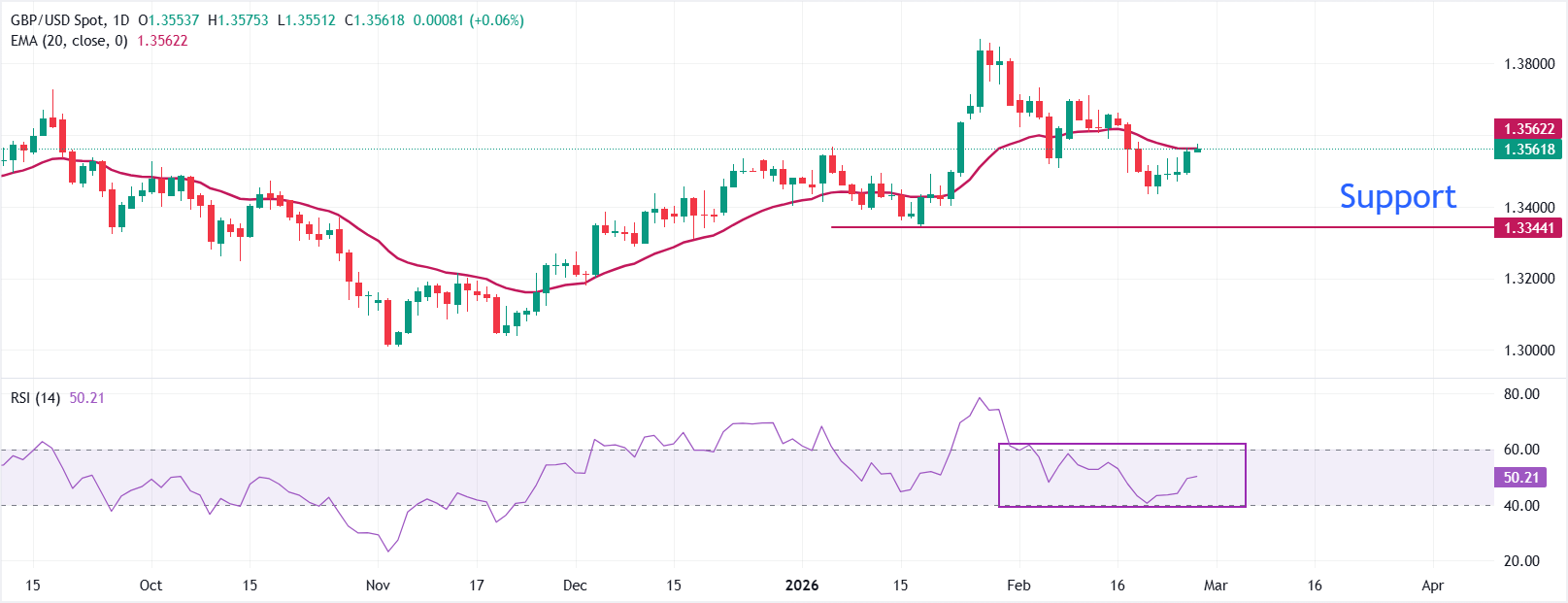 在周四的亚洲交易时段,英镑(GBP)对美元(USD)在1.3565附近维持周涨幅。由于美国贸易政策前景的不确定性,英镑/美元交易坚挺,美元仍然承压。 标题:英镑/美元价格预测:随着美元走弱,回升至接近20日指数移动平均线