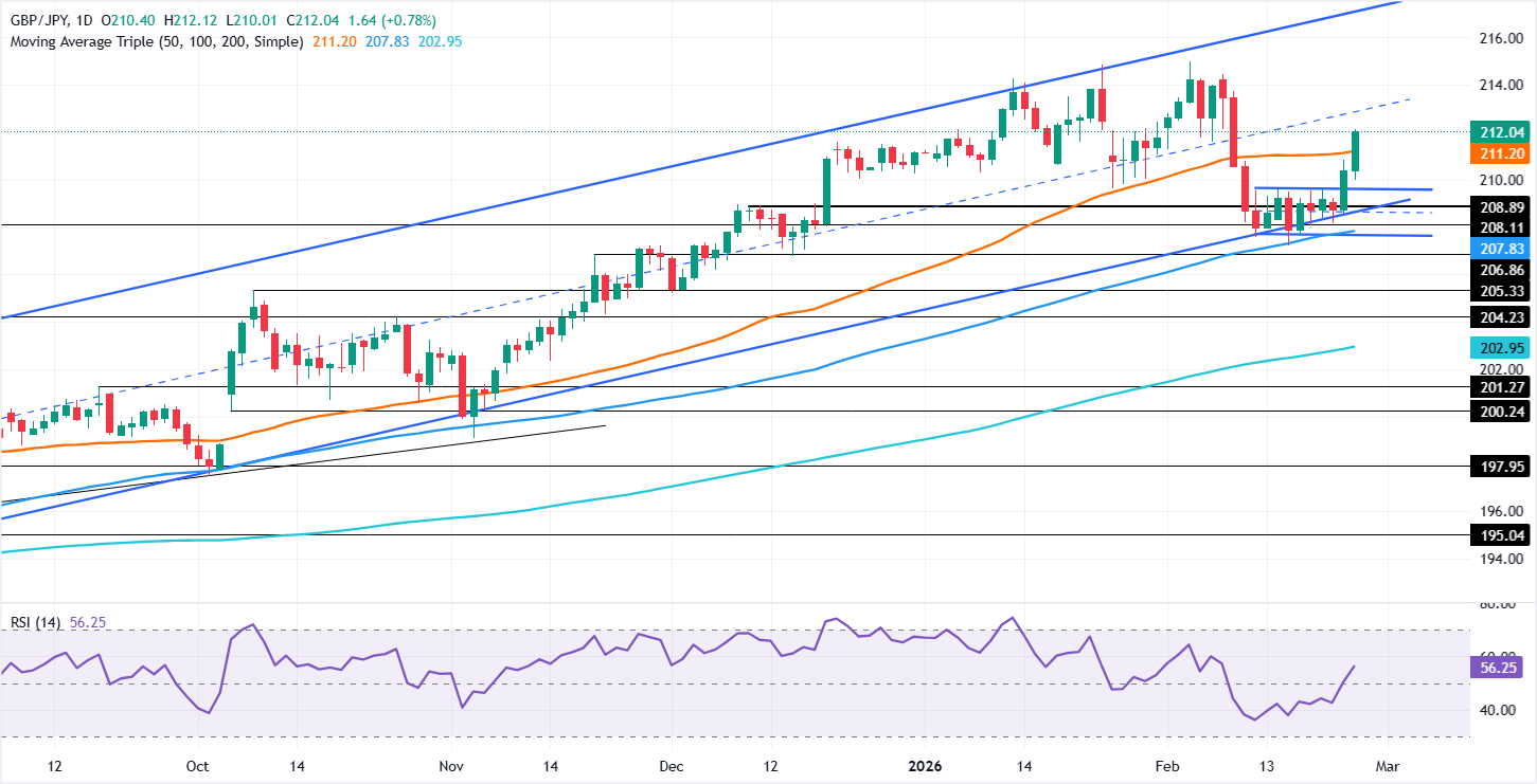 英镑/日元连续第二天上涨,涨幅超过0.80%,因日元疲软持续,日本首相高市早苗提名两位略显“鸽派”的学者加入日本央行董事会。该交叉盘交易于211.94,略低于当天的高点212.12 标题:英镑/日元价格预测:突破关键阻力,瞄准212.00