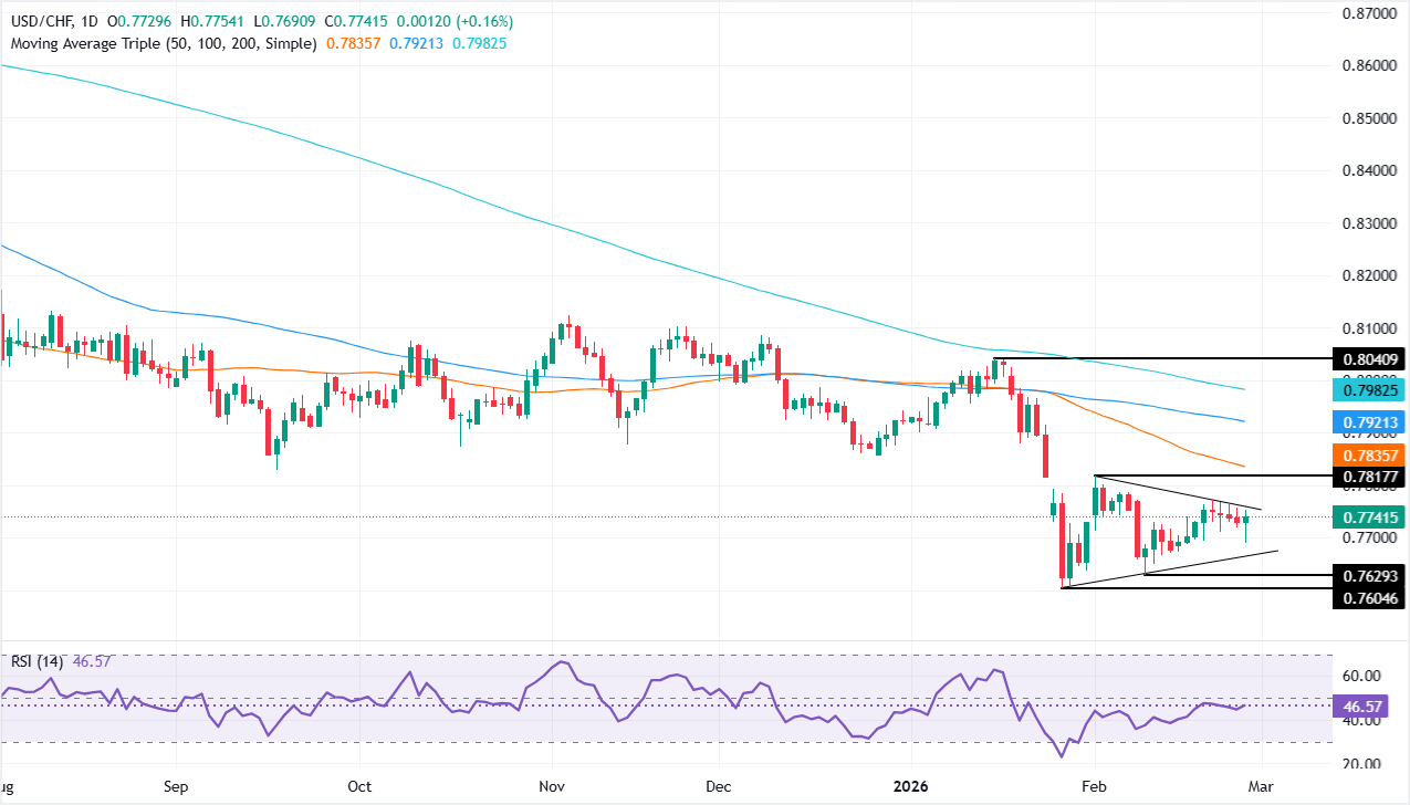 美元/瑞郎周四回升,涨幅约为0.19%,因美元走强,从0.7700以下的日低反弹,受益于稳健的美国经济数据。撰写时,该货币对交易于0.7743,但仍未突破0.7817的关键阻力位,即2月2日的日高。 标题:美元/瑞郎价格预测:在坚挺的美元上反弹,目标0.7800