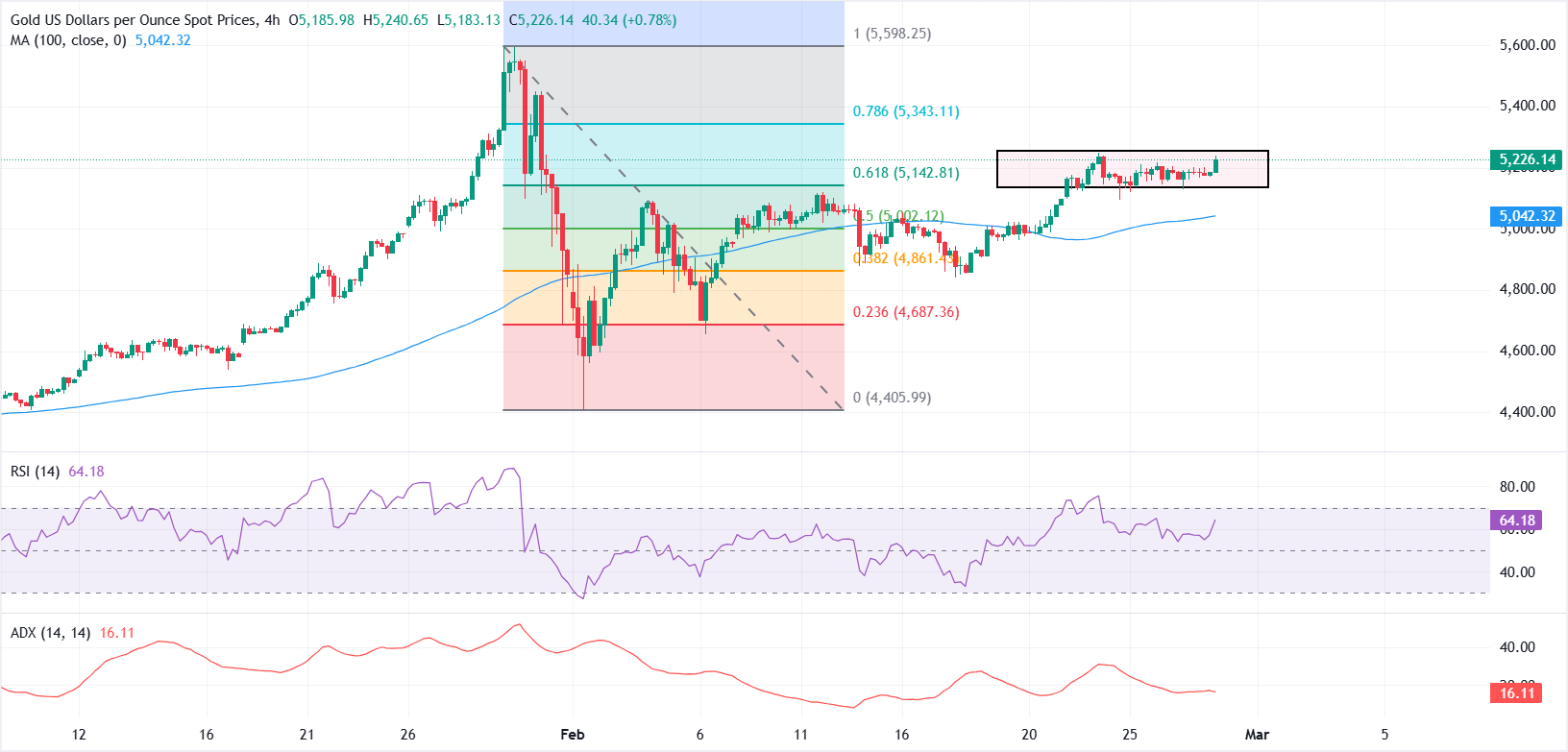 黄金(黄金/美元)周五略微上涨,逼近本周已建立区间的上限,此前有报道称美国官员建议以色列的非必要大使馆工作人员撤离,因紧张局势加剧,引发对美国与伊朗之间持续冲突可能升级的担忧 标题:黄金价格突破5200美元,因美伊紧张局势提升避险吸引力