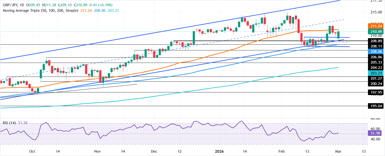 英镑/日元在周一北美时段上涨,回升0.24%,从日低209.10反弹,因美国与伊朗之间的中东冲突引发避险情绪。撰写时,该交叉盘交易于210.98,接近突破211.00关口。 标题:英镑/日元价格预测:看涨吞没形态使211.00成为可能