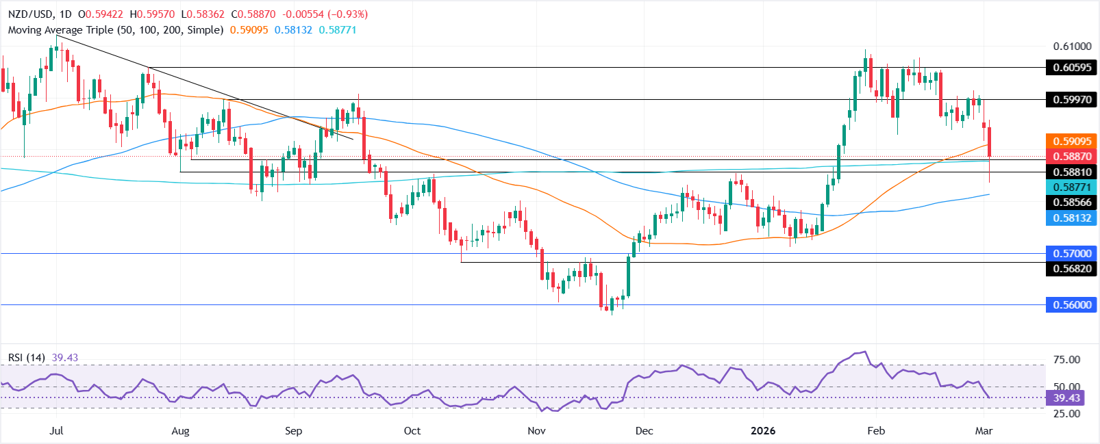 新西兰元在坚挺的美元和中东冲突的影响下,连续第二天下跌,这加剧了因油价上涨而引发的通胀上升的担忧。纽元/美元交易于0.5889,下跌0.80% 标题:纽元/美元价格预测:在测试200日移动平均线向下后,空头逼近