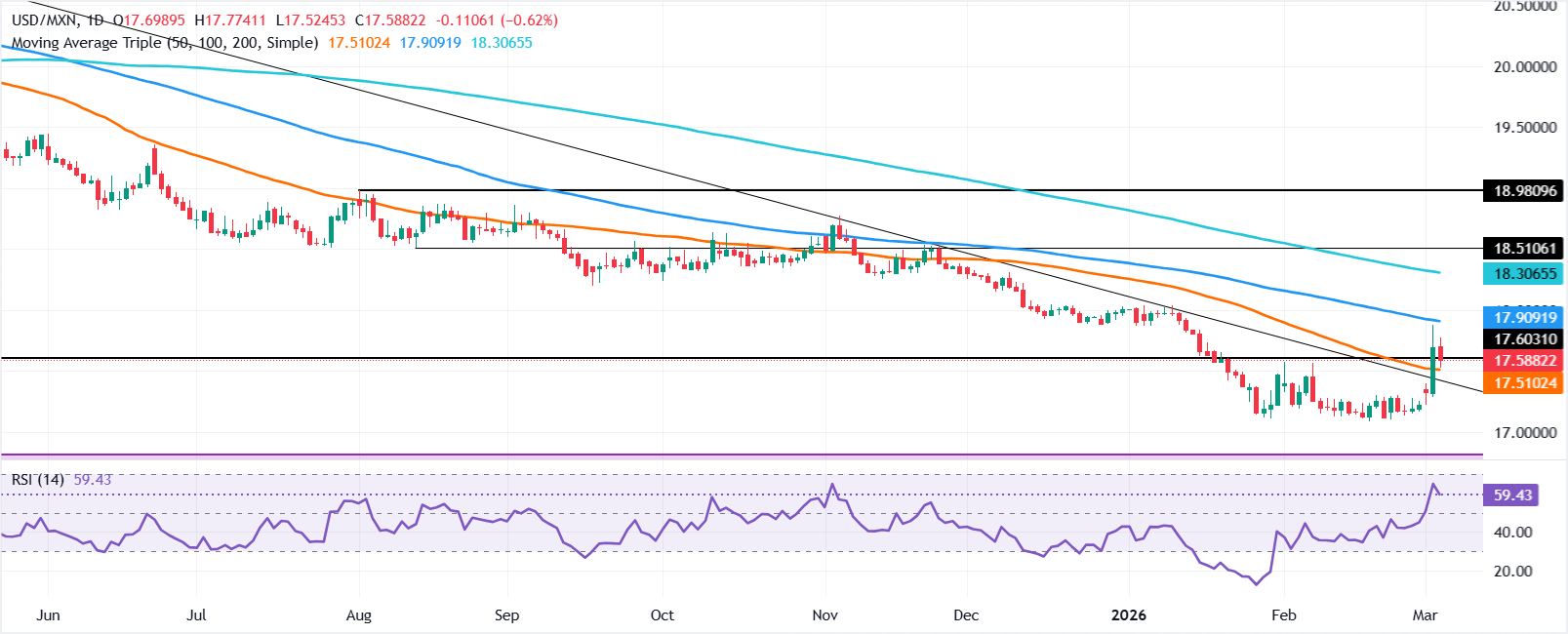 尽管中东地区的敌对行动持续了第五天,墨西哥比索在周三因风险偏好的改善而恢复了一些失地。强劲的美国经济数据被MXN多头忽视,美元/墨西哥比索交易在17.56,下跌0.74%。 标题:美元/墨西哥比索下跌至17.56,风险偏好提振墨西哥比索