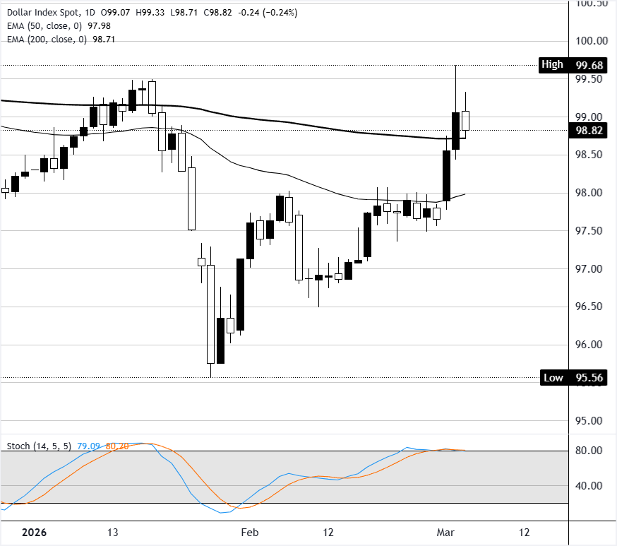 美元指数(DXY)周三下滑约0.18%,收于接近98.90,回撤自周二录得的99.68高点。 标题:美元指数从五周高点回落,避险需求减弱