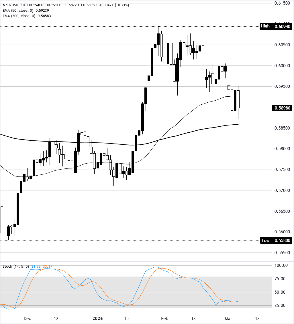 纽元/美元周四下跌超过0.7%,收于接近0.5900,触及自1月底以来的最低水平。该货币对现在已回吐了大部分2月份的涨幅,自2月初接近0.6090的高点以来,出现了一系列更低的高点,显示出看涨动能减弱。周四的交易中,价格滑落至0.5920附近的支撑区间,带有看跌蜡烛收于时段低点附近,几乎没有反弹的迹象。 标题:纽元/美元回落,避险压力加大