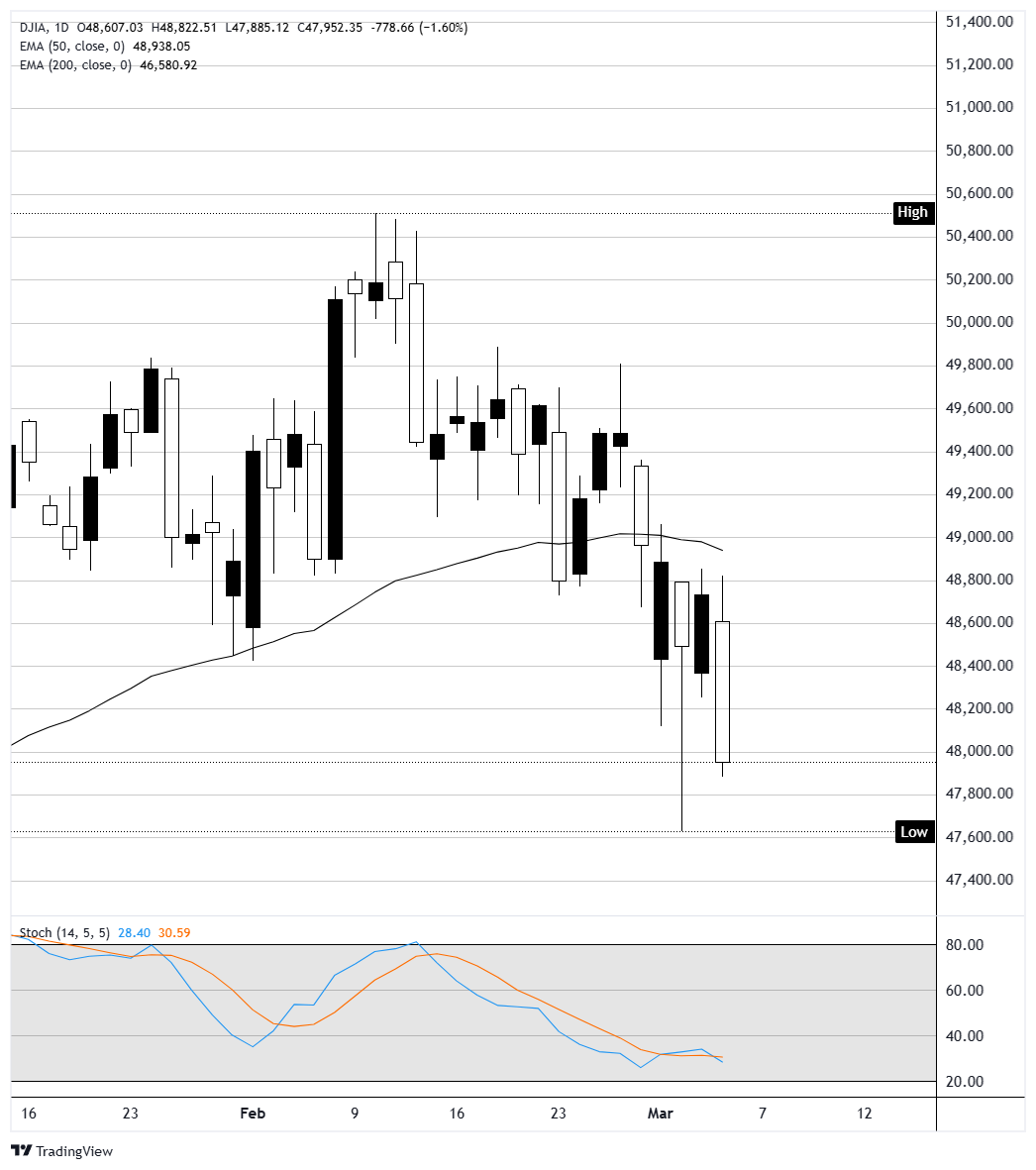 道琼斯工业平均指数在撰写时下跌了840点,或1.73%,至47,885,回吐了周三的所有涨幅。标普500指数下跌0.82%,至约6,810,而纳斯达克综合指数下跌0.50%,至22,690区域 标题:道琼斯工业平均指数因伊朗局势紧张而暴跌