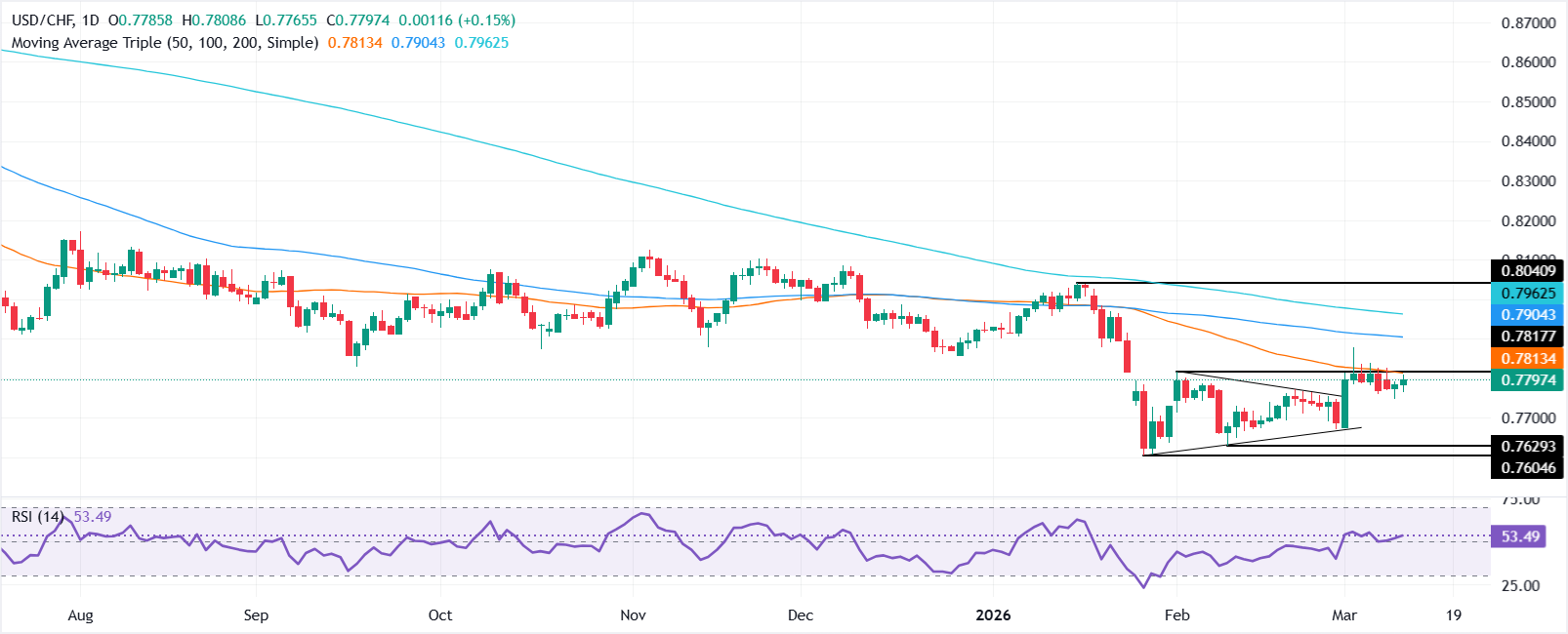 美元/瑞郎在周三连续两个交易日上涨,受最新美国通胀报告影响上涨超过0.25%,同时高能源价格推动美国国债收益率上升,从而提振美元(USD)。在撰写时,该货币对交易接近0.7800。 标题:美元/瑞郎价格预测:随着RSI转为看涨,交易者关注0.7800