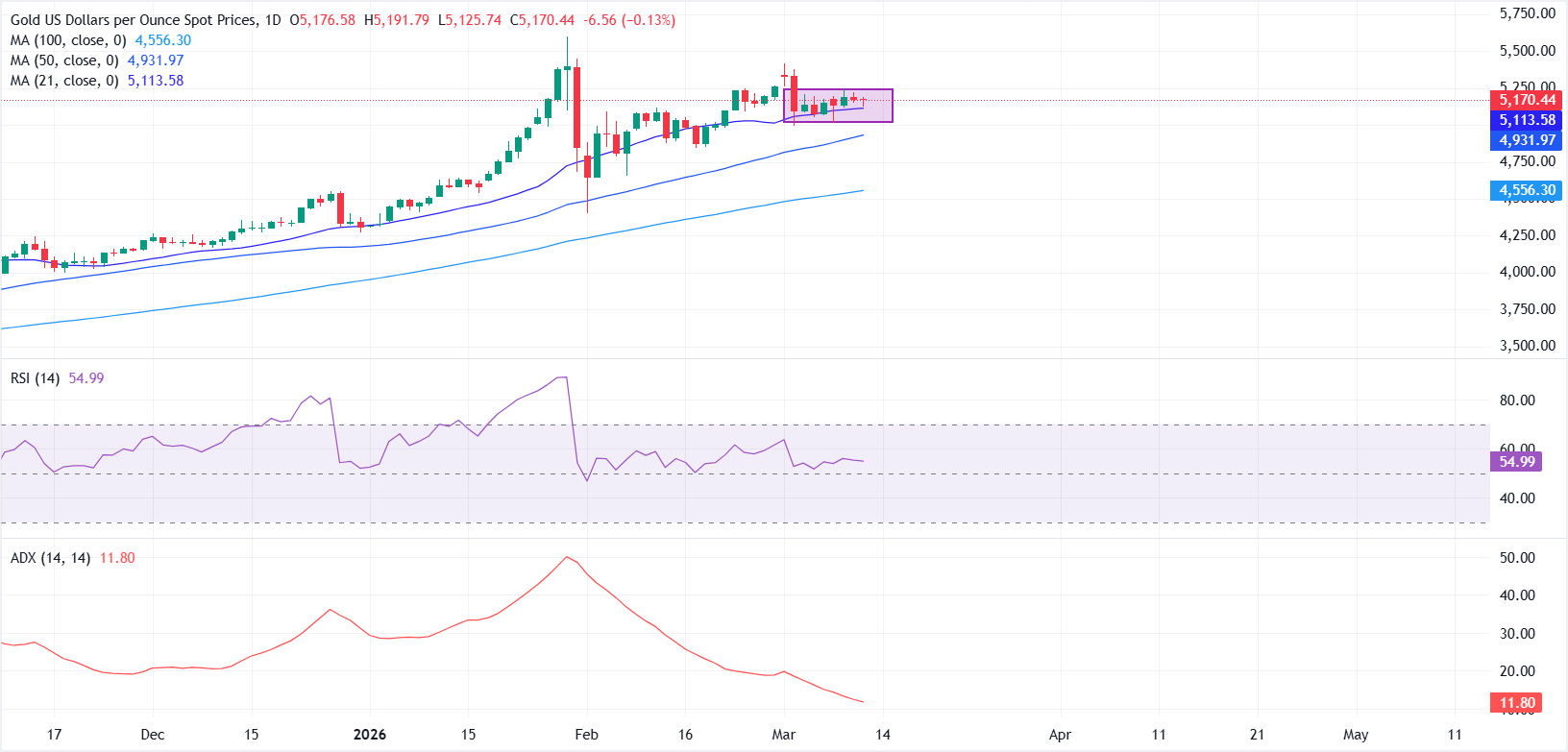 黄金(黄金/美元)周四在压力下交易,因美元(USD)走强和国债收益率上升限制了上涨尝试。截至发稿时,黄金/美元交易在5113美元附近,日内下跌近1.20% 标题:黄金在强势美元和上升的收益率限制涨幅时挣扎