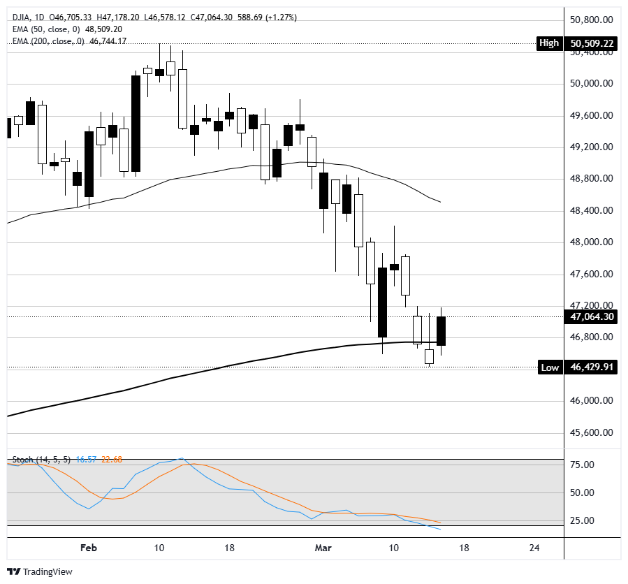 道琼斯工业平均指数(DJIA)周一上涨约1.2%,重新回到47,000以上,之前周五收盘时接近46,500。标准普尔500指数上涨超过1%,回升至6,700水平,而纳斯达克综合指数上涨超过1.2%,收于接近22,400。 标题:道琼斯工业平均指数反弹,原油价格回落
