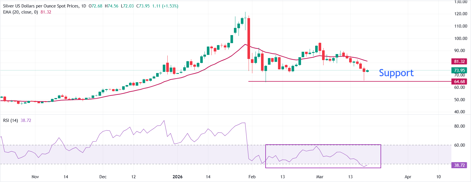 银价(XAG/USD)在周五亚洲交易时段维持周四的反弹走势,徘徊于74美元附近。该白色金属在前一日回升,此前曾触及2月份约64.00美元的低点。 标题:白银价格预测:白银/美元在74美元附近维持反弹走势,前景依然黯淡