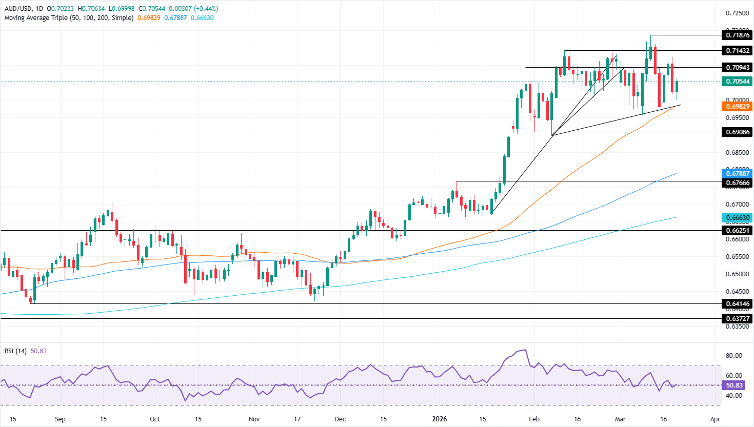 尽管交易员推迟了美联储(Fed)降息,但由于美元(USD)走弱,澳元/美元周四上涨约0.47%,而美国原油价格下跌4.21%,对美元构成利空。撰写时,该货币对徘徊在0.7050附近。 标题:澳元/美元价格预测:澳元金额在50日均线上方转为看涨,关注0.7100