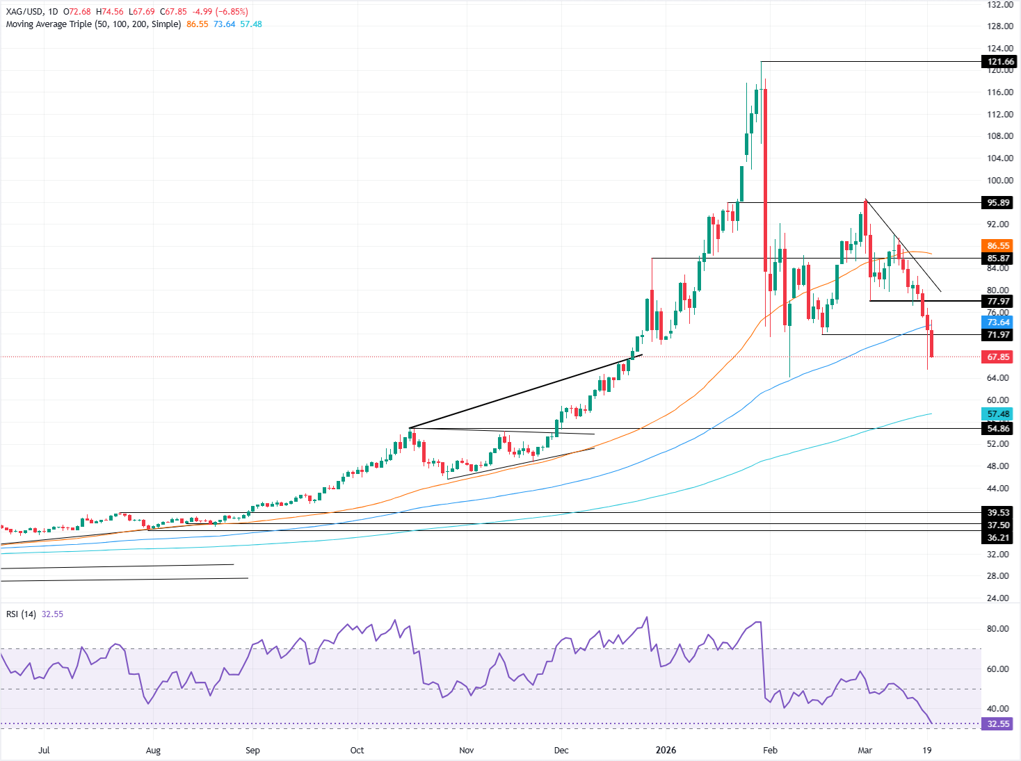 银价(白银/美元)在北美时段尾盘回落,当日下跌超过6.80%,有望以超过15.70%的周跌幅收官,创下自1月30日当周下跌17.39%以来的第二大周跌幅。撰写本文时,XAG/USD报67.89美元。 标题:白银价格预测:白银/美元暴跌,跌破70美元以下关键水平