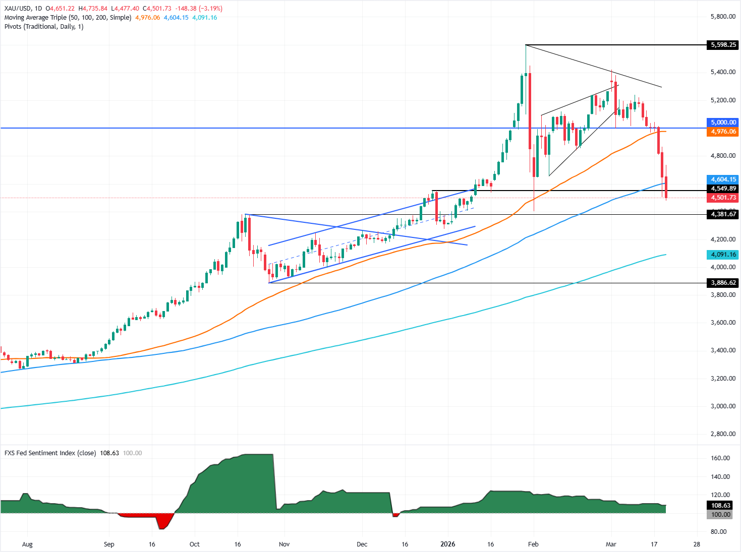 黄金(XAU/USD)价格周五连续第八天下跌,预计本周累计下跌超过 8.50%,因油价持续反弹,提升了美元的避险吸引力。 标题:黄金接近4500美元下滑,因石油上扬和美国收益率对金价施压