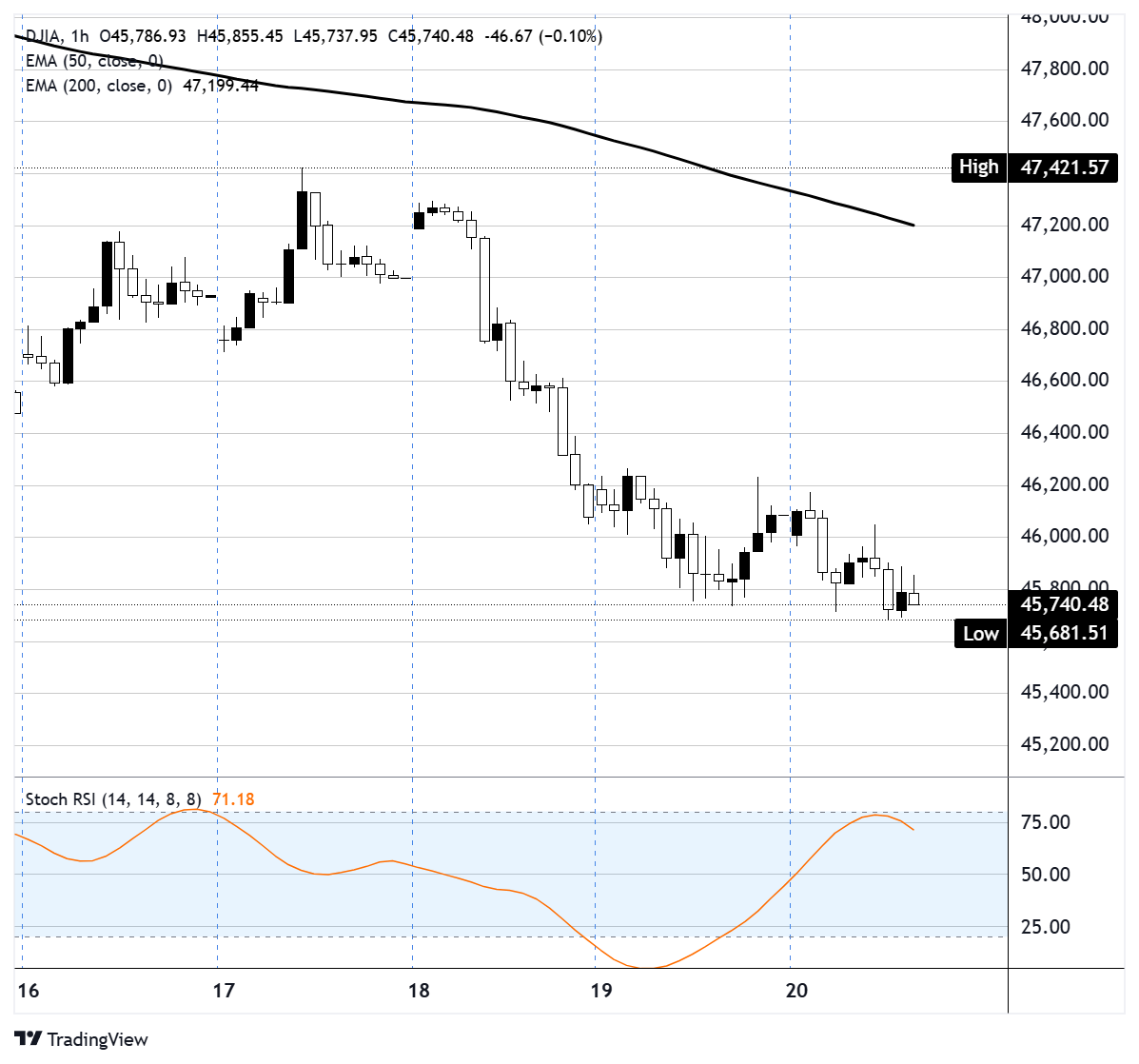 道琼斯工业平均指数(DJIA)周五下跌约257点,跌幅为0.6%,三大美国主要股指均朝着连续第四周下跌的方向发展。标普500指数下跌0.8%,纳斯达克综合指数表现更差,跌幅为1.2% 标题:道琼斯工业平均指数下滑,伊朗战争与偏鹰派美联储推动连续第四周下跌