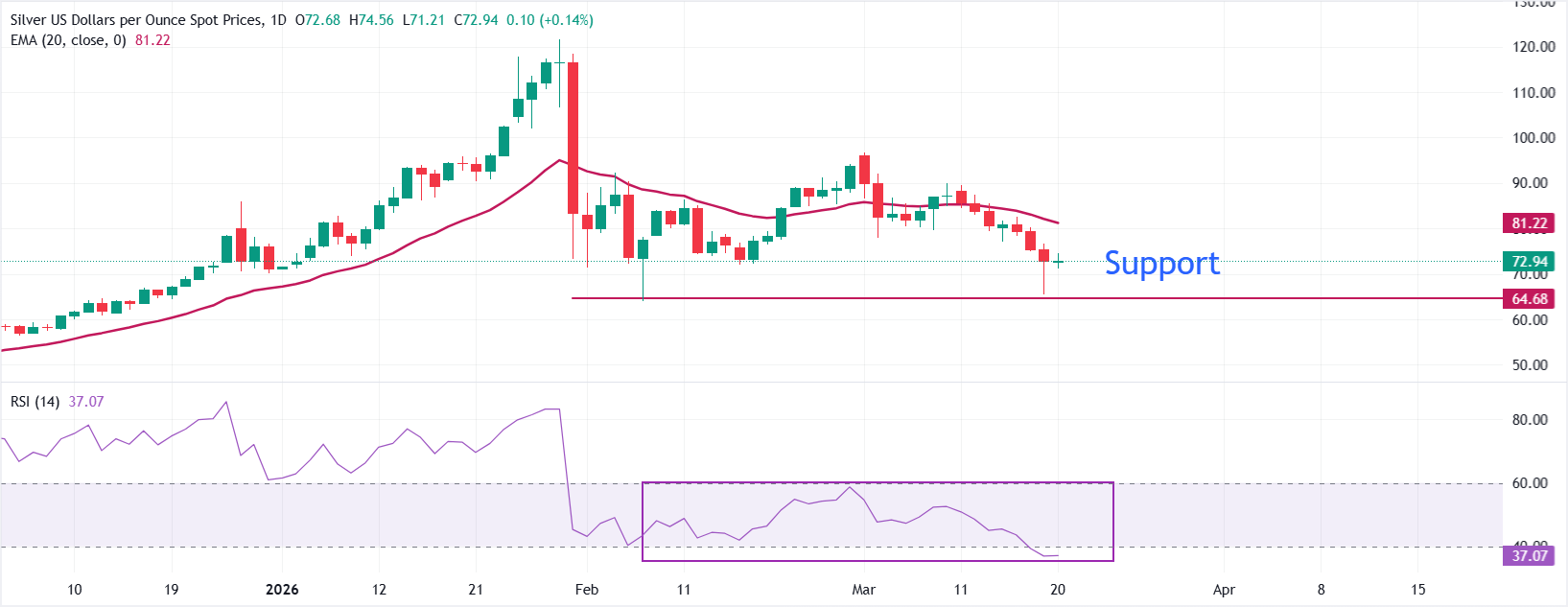 白银价格(XAG/USD)在周五欧洲交易时段于72.80美元附近窄幅波动。该贵金属维持了周四因美元(USD)走弱而推动的反弹走势。从技术面看,美元走低使白银价格成为投资者具有吸引力的风险回报交易品种。 标题:白银价格预测:白银/美元将连续第三周收盘走低