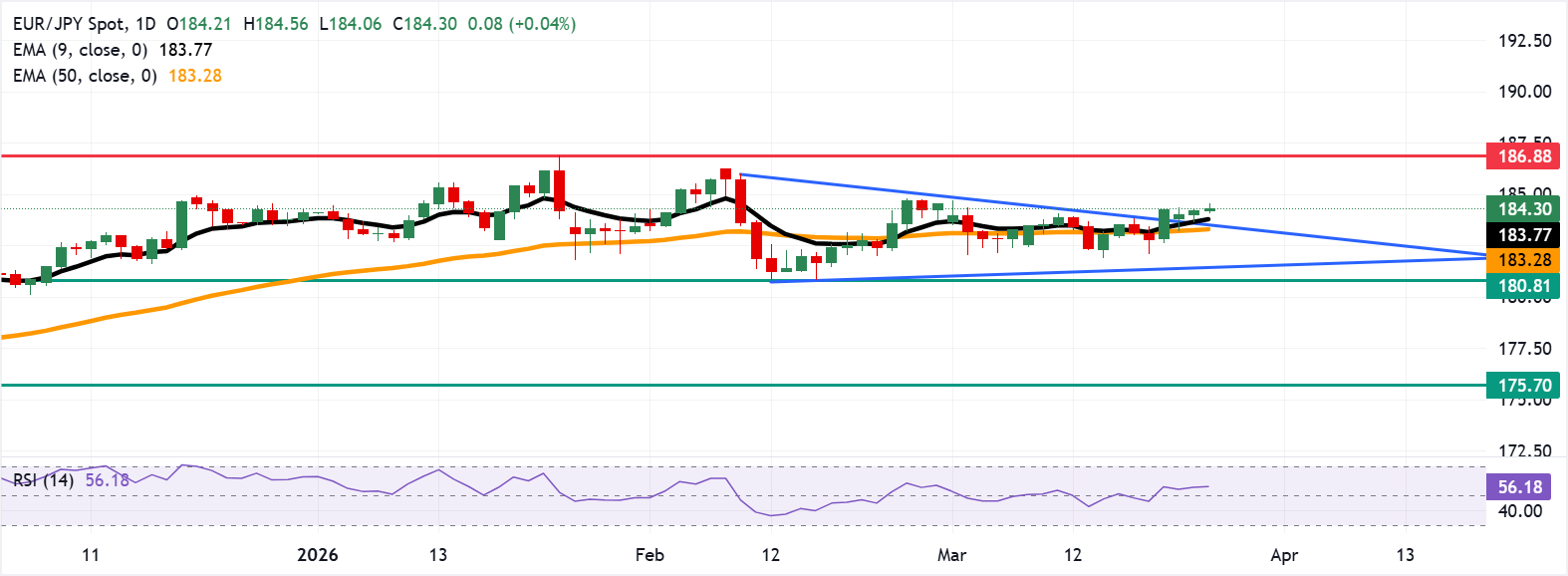 欧元/日元连续第四个交易日走强,周三亚洲时段徘徊在184.30附近。日线图的技术分析显示,现货价格正上破下降三角形的上边界,这通常预示着看涨反转。 标题:欧元/日元价格预测:守住184.00附近汇合点上方的涨幅