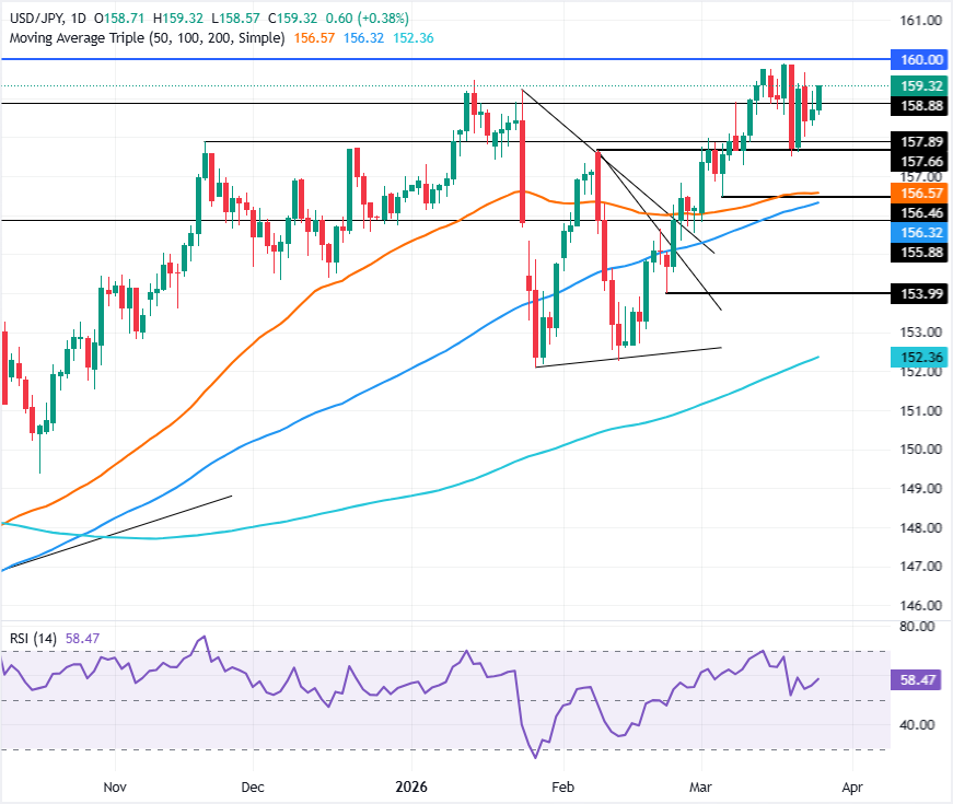 美元/日元在周三连续录得看涨走势,此前周一测试了位于158.24附近的20日简单移动均线(SMA)关键支撑,但仍未能突破周一触及的关键周高点159.65。撰写时,该货币对交投于159.27,上涨0.36%。 标题:美元/日元价格预测:美元延续上涨但在159.50附近受阻