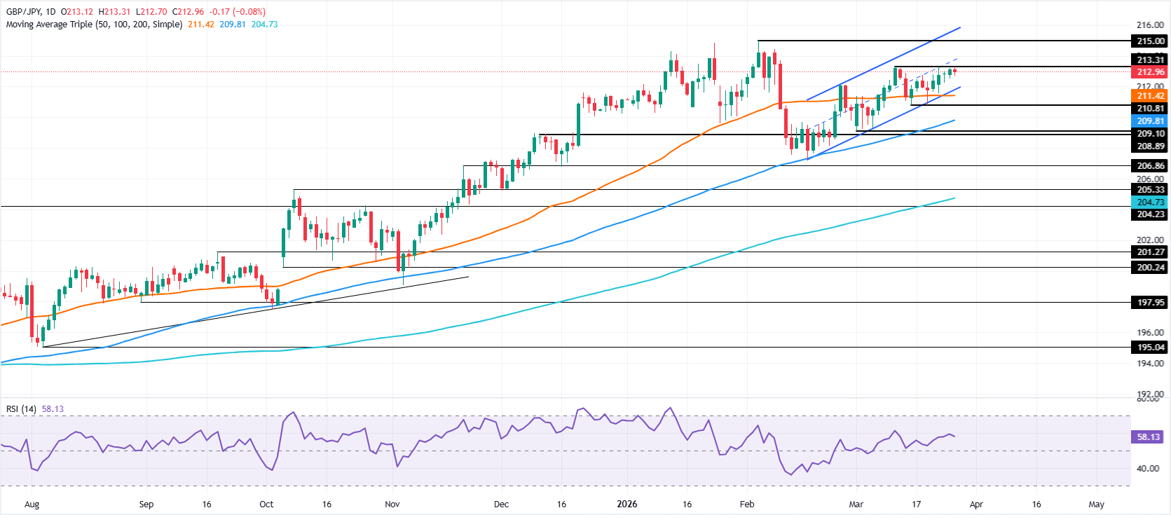英镑/日元连续第二天在213.00附近盘整,下跌0.09%,终结了连续四天的涨势,因交易者在关键阻力位——3月11日高点213.31附近展开争夺。 标题:英镑/日元价格预测:在213.00遇阻,空头旗形迹象显现