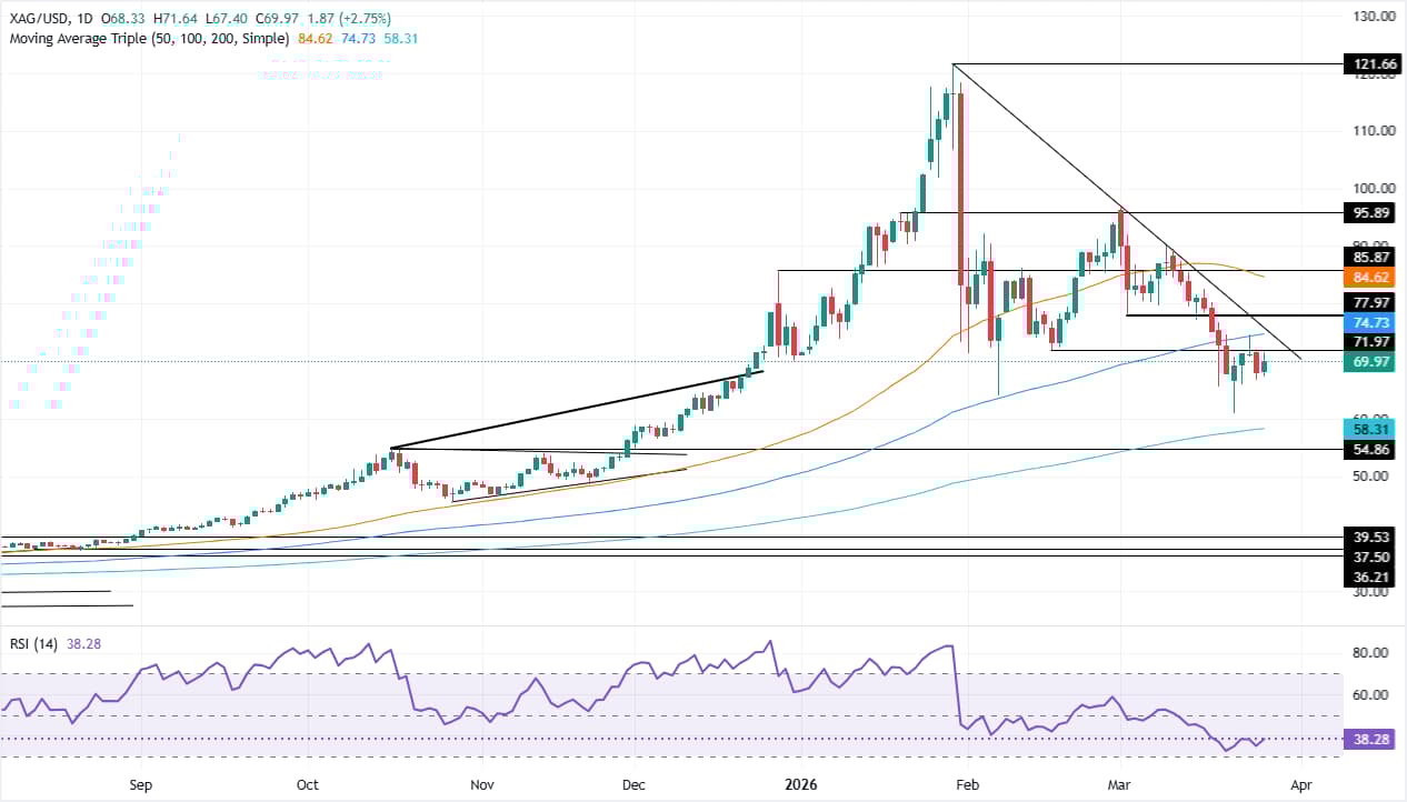 白银(XAG/USD)价格在连续两个看跌交易日后于周五转为上涨,因中东紧张局势加剧削弱了白银作为避险资产的吸引力,促使交易者转向美元(USD) 标题:白银价格分析:反弹受限于70美元下方,跌势风险依然存在