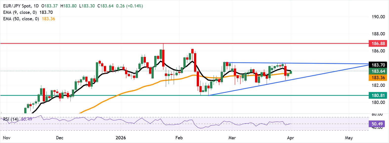 欧元/日元连续第二天上涨,周三亚洲时段交投于183.60附近。日线图的技术分析显示,该货币对在上升三角形形态内横盘,反映出买盘压力。 标题:欧元/日元价格预测:保持在183.50以上以测试九日EMA阻力