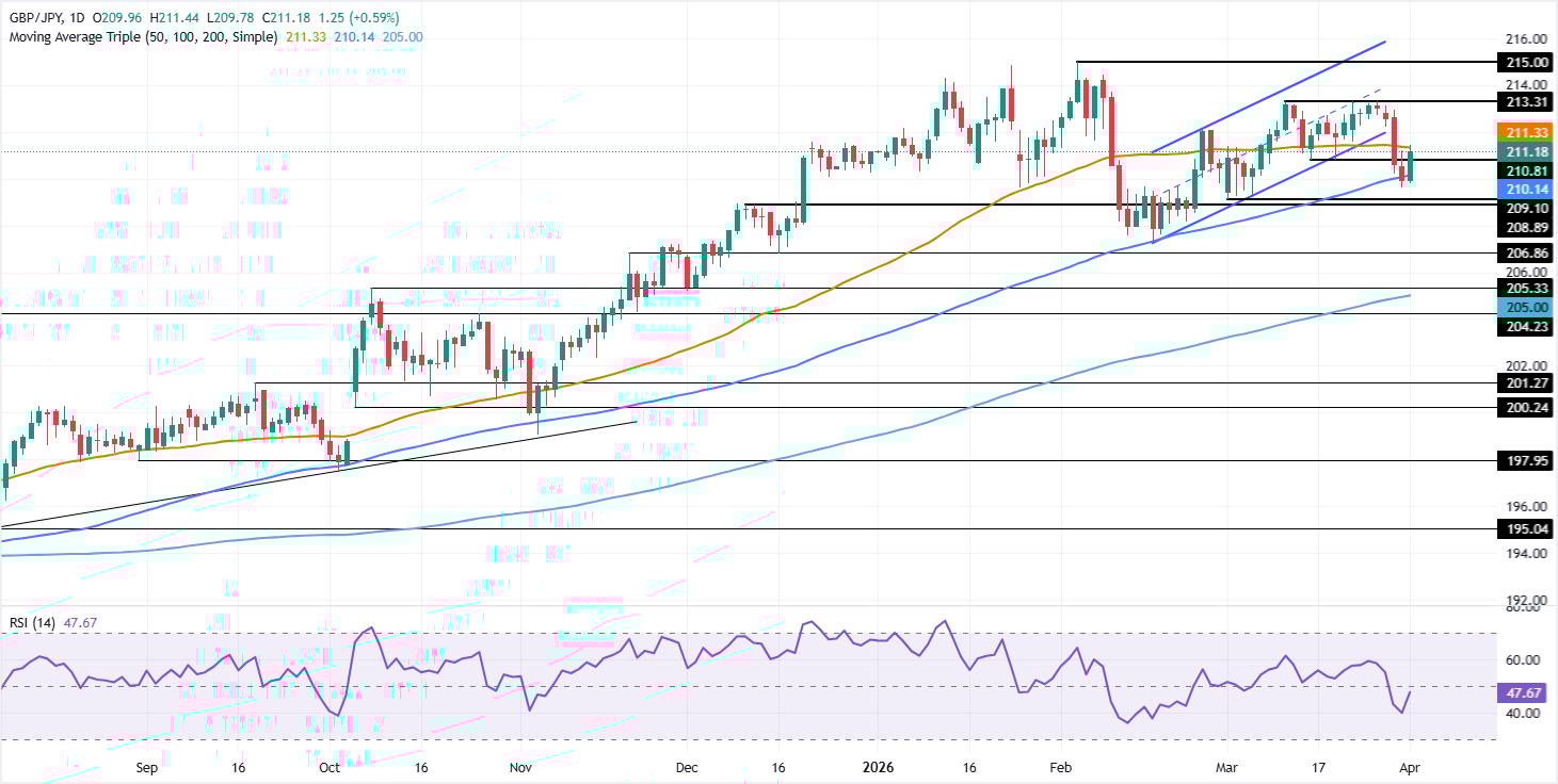 周三,随着市场情绪因伊朗战争可能结束的猜测而改善,英镑/日元上涨近0.60%。尽管该货币对在210.08的100日简单移动均线(SMA)处获得支撑,但在地缘政治不确定性中,市场情绪依然脆弱。 标题:英镑/日元价格分析:反弹但在211.00面临强劲阻力