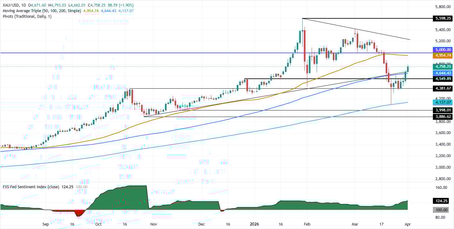 黄金(黄金/美元)价格周三连续第四天上涨,触及近两周高点约4800美元,因美元贬值,市场对中东冲突结束的猜测日益增加。撰写时,黄金/美元报4758美元,涨幅近2%。 标题:黄金接近4800美元,美元走弱推动金价连续第四天上涨
