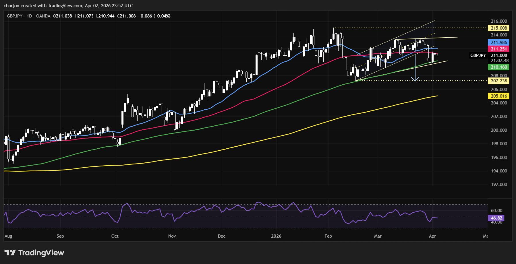 由于美国总统唐纳德·特朗普透露美军任务将延长两到三周,中东地区紧张局势加剧,风险偏好转差,英镑/日元在211.00附近盘整。 标题:英镑/日元价格预测:随着出现上吊线形态,在211.00挣扎
