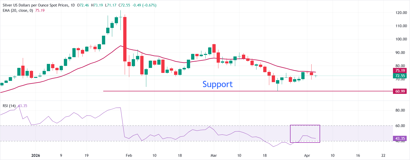 周一亚洲尾盘,银价(白银/美元)下跌0.7%,至约72.50美元,但整体在有限区间内盘整。随着投资者等待伊朗对美国总统唐纳德·特朗普的最后通牒作出回应,这种贵金属走势趋于横盘。 标题:白银价格预测:白银/美元在特朗普最后通牒倒计时中徘徊于72.50美元附近