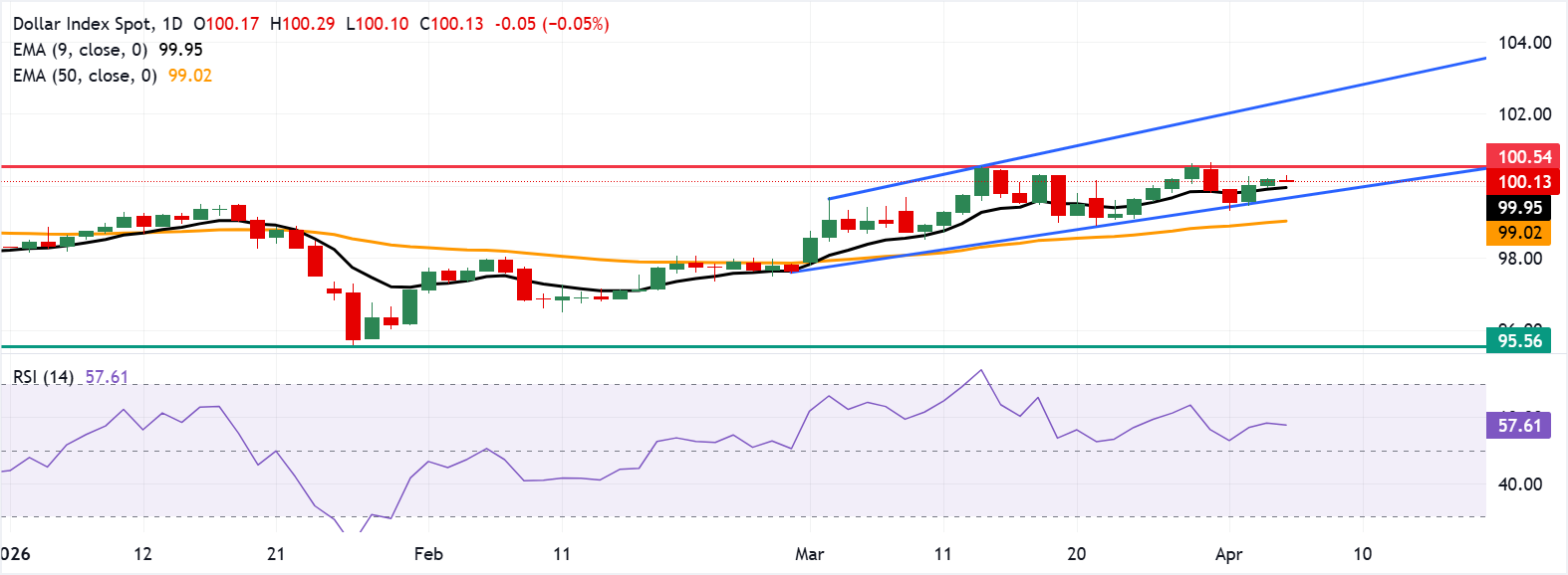 美元指数(DXY)衡量美元(USD)相对于六种主要货币的价值,在连续两天上涨后小幅回落,周一亚洲时段交投于100.10附近。日线图的技术分析显示,美元指数正在上升通道形态内盘整,表明看涨偏好持续存在。 标题:美元指数价格预测:维持在100.00的九日EMA之上