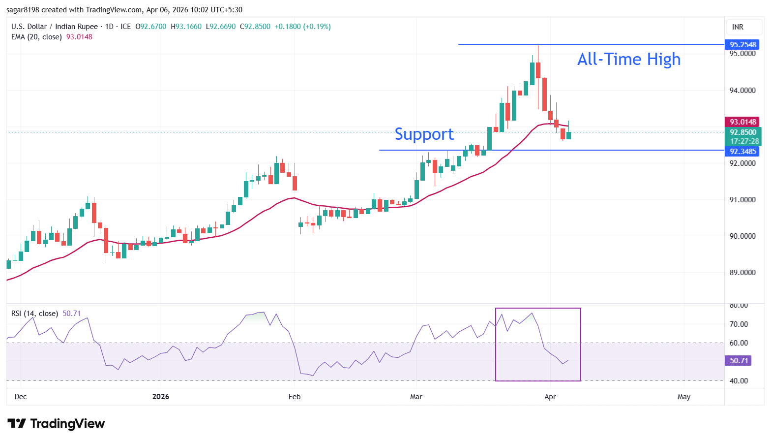 印度卢比(INR)在印度储备银行(RBI)货币政策周开始时兑美元(USD)开盘持平后下跌。由于美国总统唐纳德·特朗普对伊朗基础设施发起新一轮袭击威胁,油价坚挺,成为拖累印度卢比的主要因素,美元兑印度卢比汇率升至接近92.85。 标题:美元/印度卢比因中东风险拖累印度卢比而上涨
