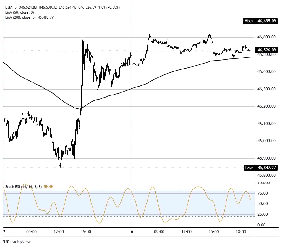 道琼斯工业平均指数(DJIA)在复活节后的首个交易日周一微涨120点,涨幅为0.3%。该指数在早盘交易中一度冲向46,700点,随后在午盘时段回落,最终收于约46,500点。标普500指数上涨0.4%,纳斯达克综合指数上涨0.5%,延续了上周分别上涨3%、3.4%和4.4%的涨势。周一的交易日是交易者首次有机会消化周五公布的3月份非农就业报告(NFP),数据显示经济新增就业岗位178K,远超预期的60K。 标题:道琼斯工业平均指数上涨,停火谈判提振市场情绪