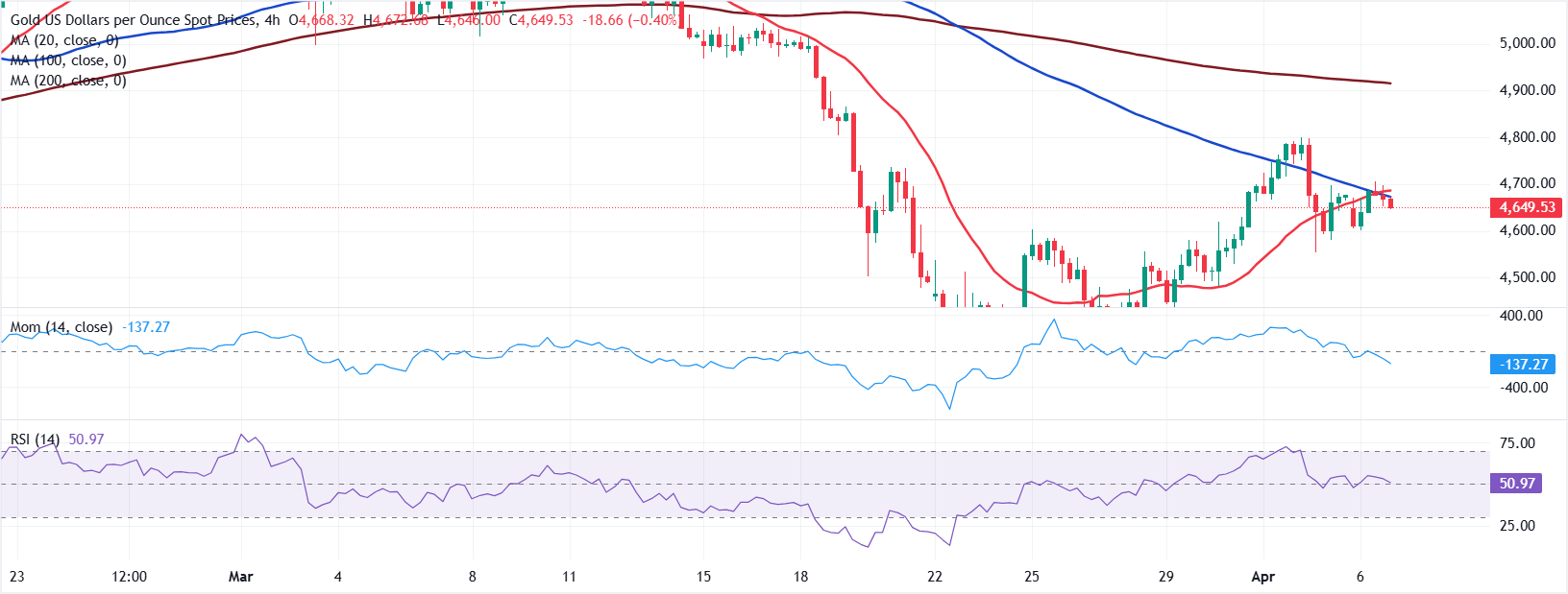 现货黄金周一在4660美元附近盘整,日内变化不大,但较周五收盘价有所下跌。金融市场在周初主要受情绪影响,市场情绪随着伊朗战争头条新闻的节奏波动。 标题:金价预测:黄金/美元徘徊在4660美元附近,空头磨利爪牙